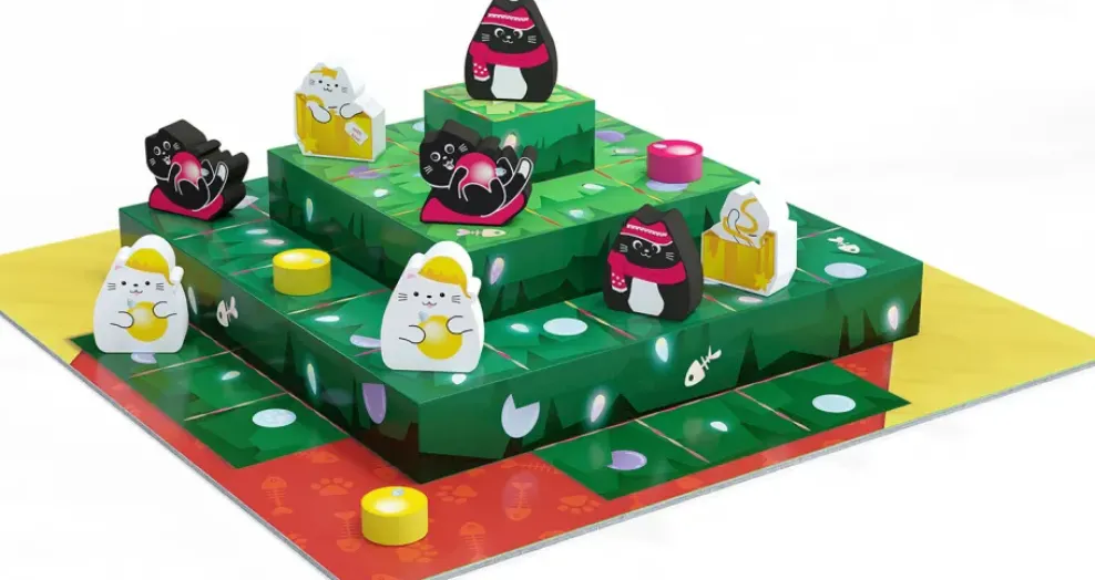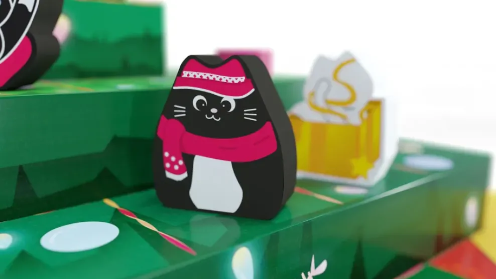 The 4-tiered game board ‘tree’ presents a surprisingly mind-bending 3D challenge for players. And the alternate win condition of knocking off 3 of your opponent’s ornaments creates new strategic problems to solve, elevating the play experience to a new high!