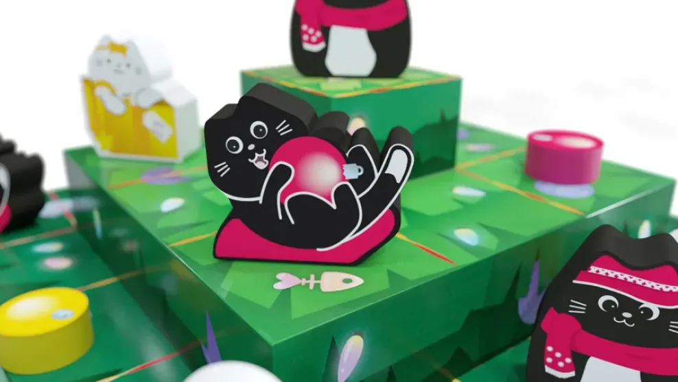 The hoomans are hanging ornaments on the highest boughs of the tree, but those clever cats are leaping up and boopin’ them right off. You can win “Naughty” by knocking off 3 of your opponent’s ornaments or “Nice” by lining up three cats in a row!