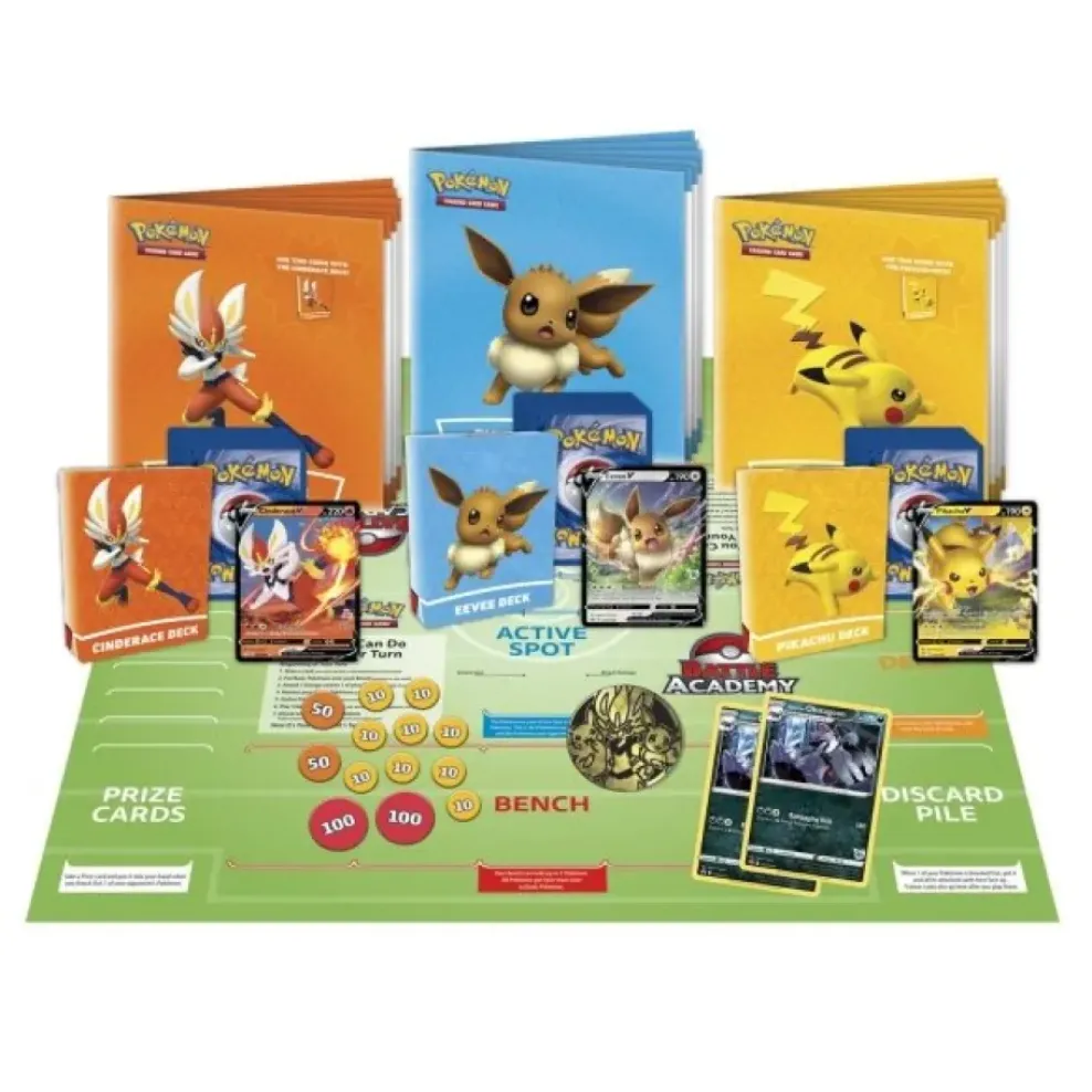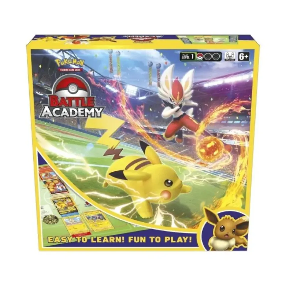 Prepare for a Pokémon battle with the ready-to-play Pokémon Trading Card Game Battle Academy! The Battle Academy includes everything two players need to play, with guides to the decks so your first game is easy to follow. You can choose Cinderace or Pikachu to lead your team in a heads-up battle against another Trainer. Then, switch up the decks to play Eevee against Cinderace or Pikachu, and lead a different team of Pokémon into the arena! With a little strategy and a little luck, you can battle with the best!