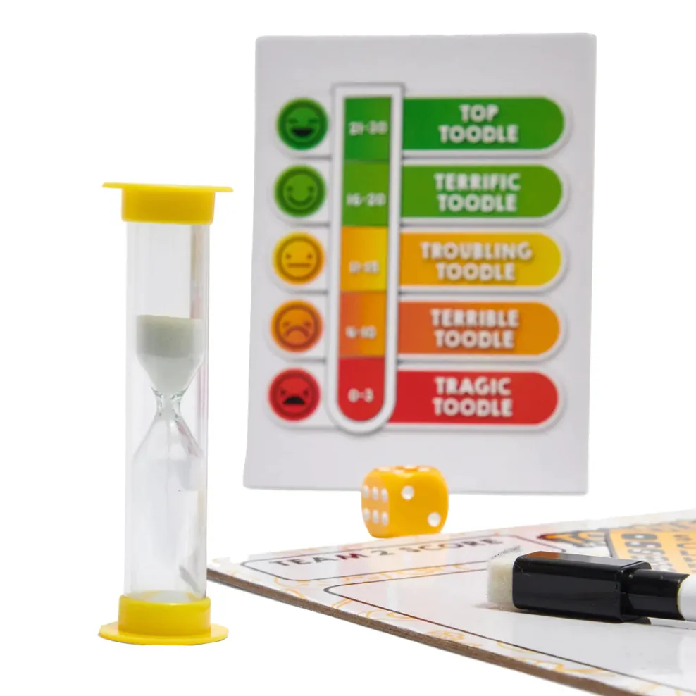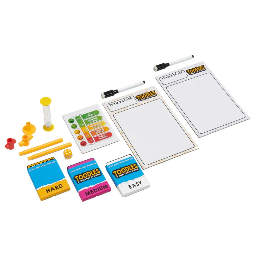In Toodles, two players have to collaborate on a drawing, at the same time. By inserting their Toodle wands into the the Toodle Pen Holder they have control of the pen. And have just 30 seconds to draw one of the items selected by a dice roll, on a card.