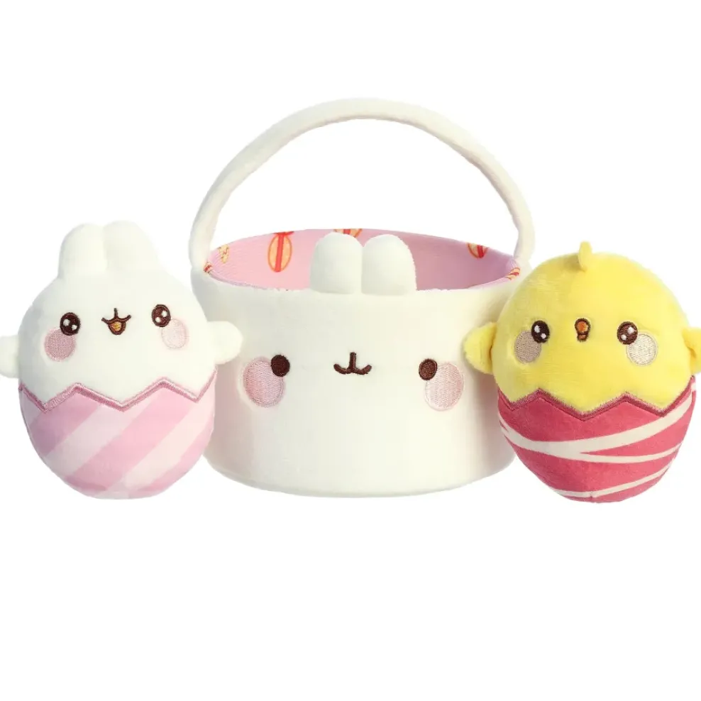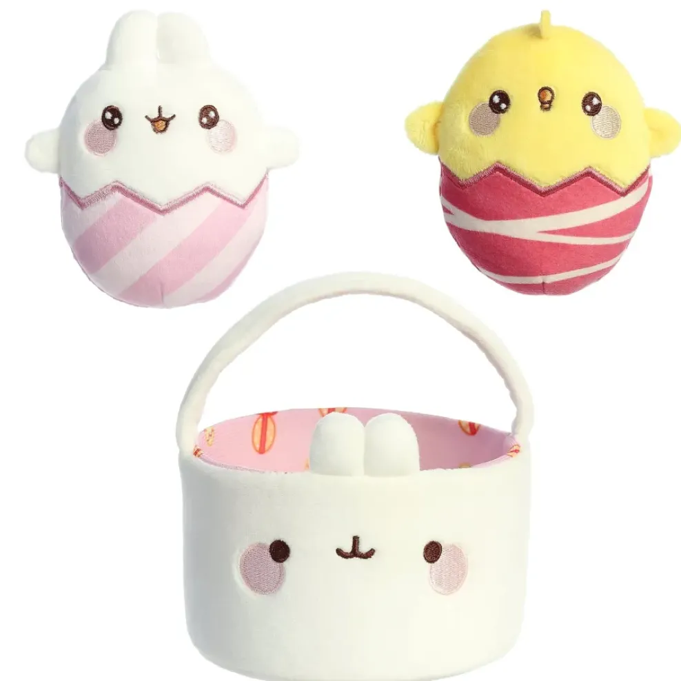 Celebrate Easter with Molang and Piu Piu! Inside this super sweet Molang Easter Basket has Molang and Piu Piu popping out of specially colored Easter eggs so they can join along on the hunt of a life time! Each Molang item comes with a unique, collectible trading card featuring special character art.
