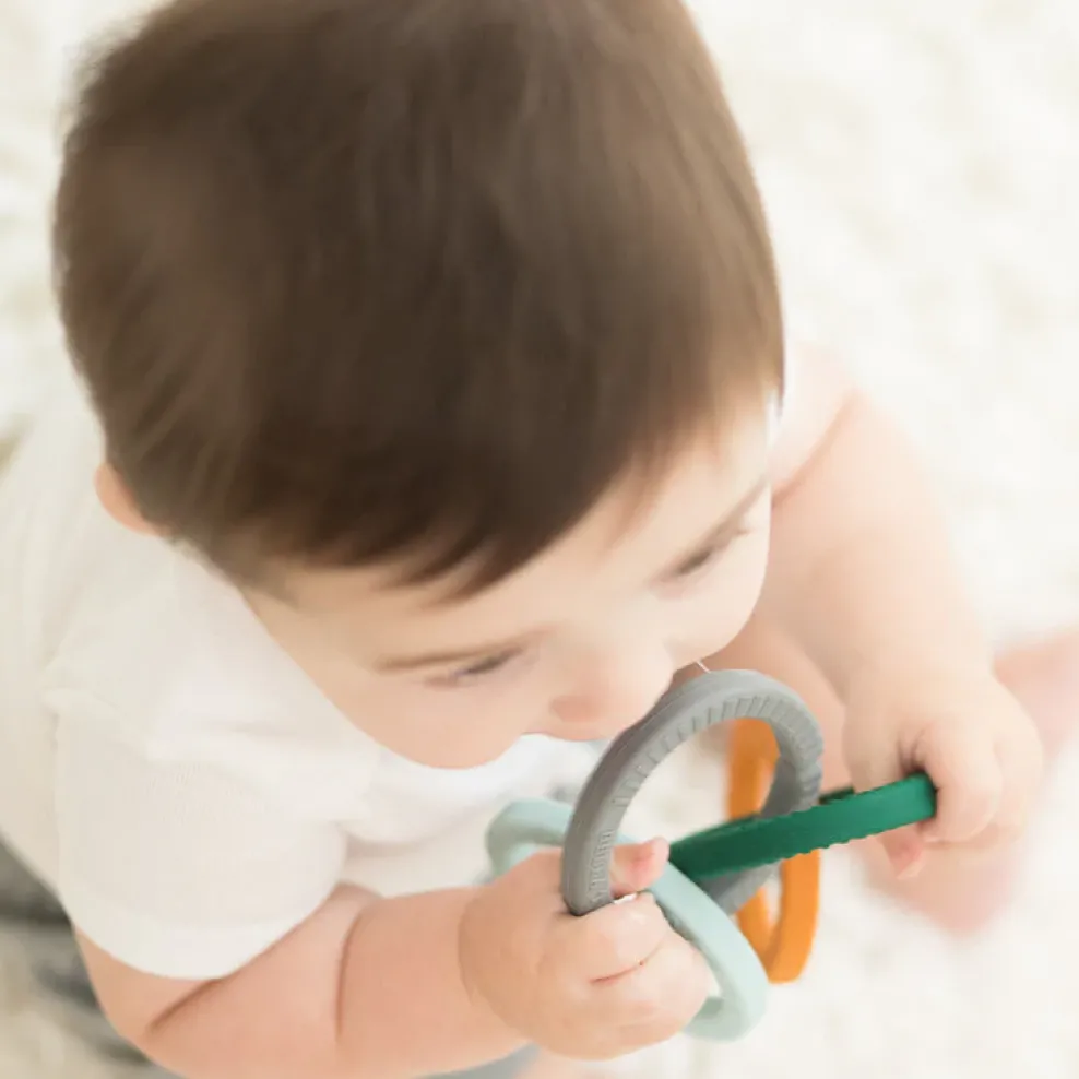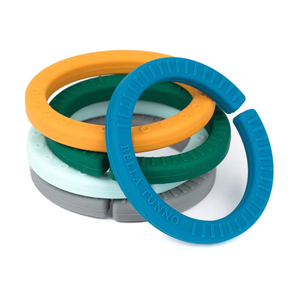 Introducing your new favorite product. Is it a toy? A teether? A link? Yes, it is. It’s pretty much magic what our Happy Links can do. We took the classic link and made it into the product we wish we had for our littles. Generously sized, easy to grip and wrapped in food-grade silicone, our links relieve little gums, keep toys and lovies attached and keeps kids entertained. Our Happy Links set includes 5 links for teething playing and organizing. Attach them to the stroller, rocker, play gym, or carrier to bring the fun wherever you go.