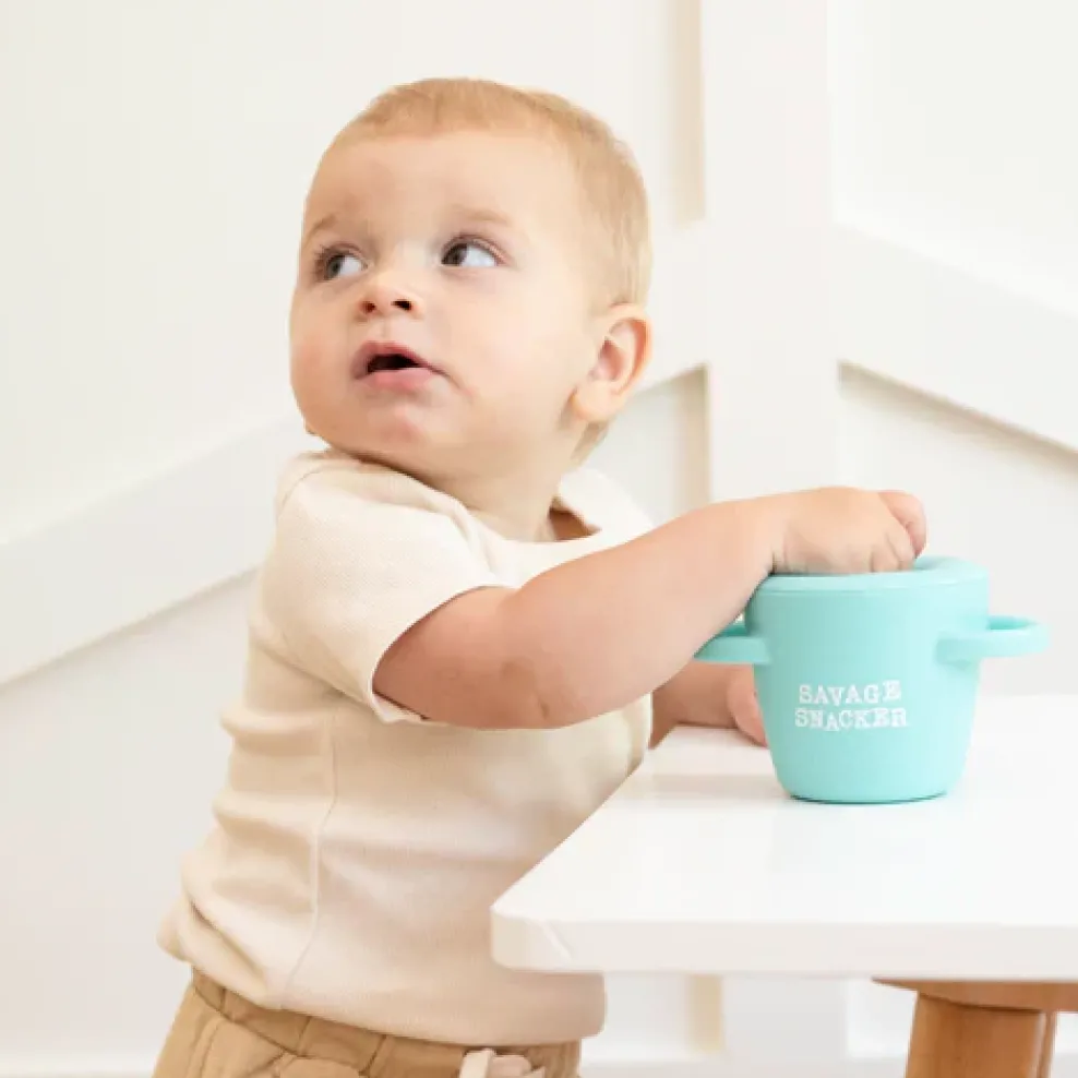 Exclusively ours, the Happy Snacker is the first two piece silicone snack cup! No more trails of crumbs to pick up thanks to our snap tight lid – go ahead and put the vacuum away. Designed with easy grip handles for little hands to independently self-feed. Hold the applause because there’s more… The horizontal handles allow the cup to securely fit in the car seat and stroller cup holders. The simple two-piece design makes pouring in snacks a breeze! The mess proof, tight lid stays in place. The soft silicone opening allows little hands to easily access food and prevents spills. Just pop the lid off when you are ready to clean it, each piece is dishwasher safe. Happy snacking! FEATURES -Snug fit and removable lid -Fits most cup holders and snack trays -Soft opening -Great for home or on-the-go