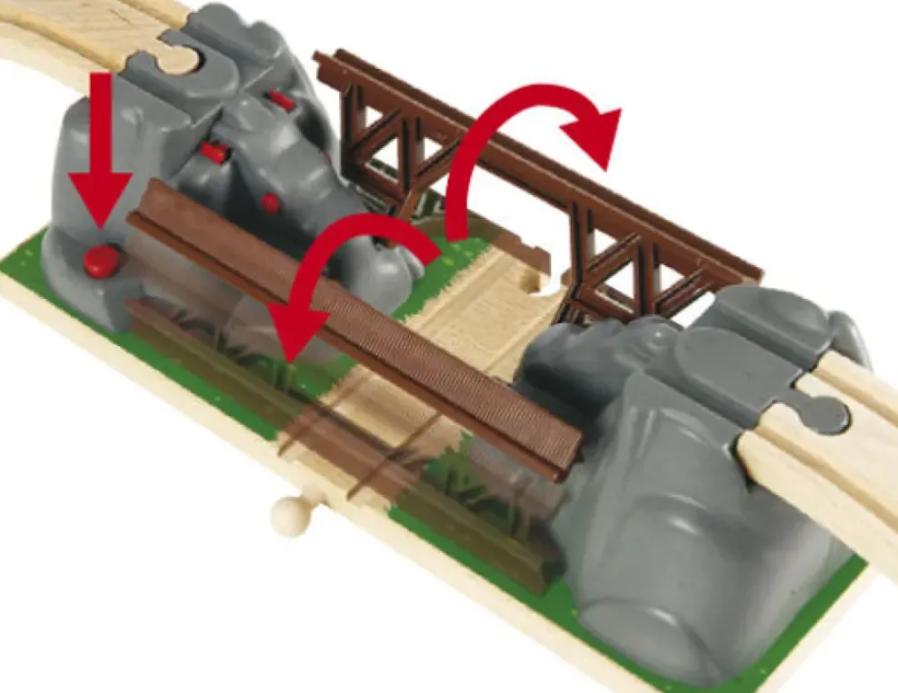 The 33391 Collapsing Bridge is an exciting addition to any BRIO World train set. Build the bridge into your existing layouts and enjoy driving over and under the bridge. Use the two ascending wooden tracks to get up and over the bridge and the lower level track to pass under. Be careful though. If you press the red button, the bridge will quickly collapse, causing the train to fall to the canyon below. Then simply put the bridge back together and the adventure can start all over again.