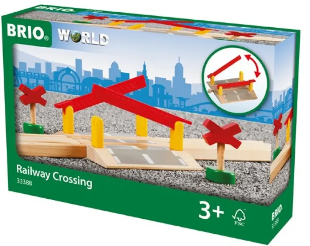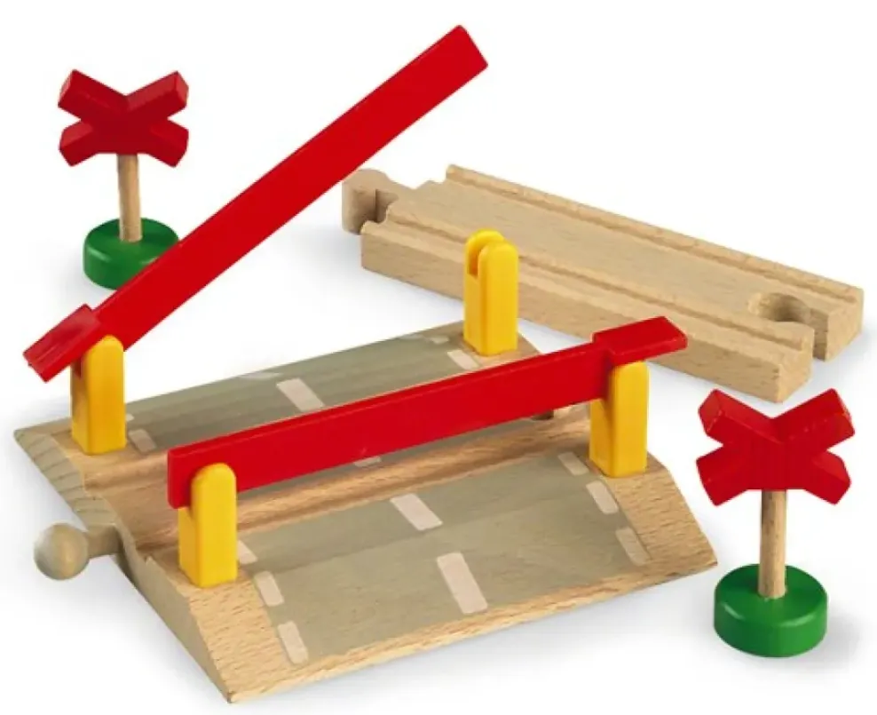 Warning signs indicate a railway crossing. Lower the bars and let the train pass, then open the crossing to road traffic again. The railway crossing fits right on your BRIO train tracks.