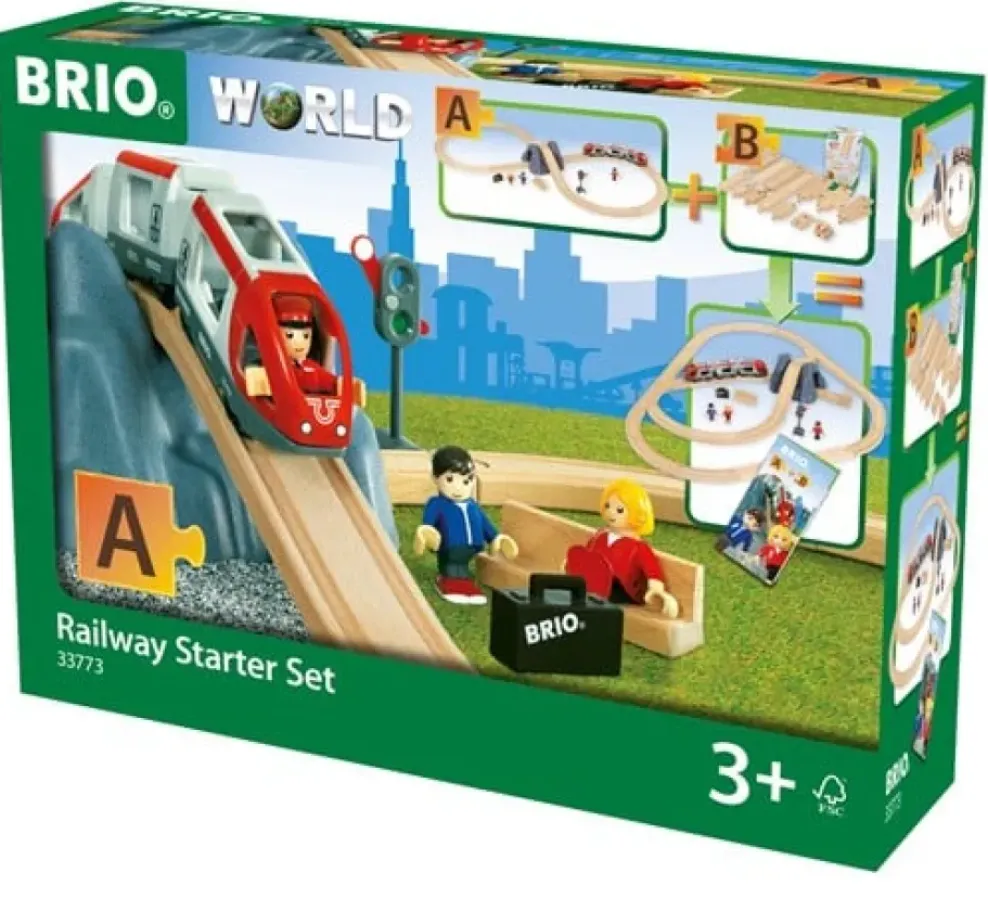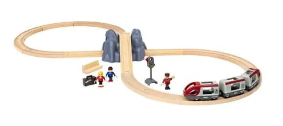 The 33773 Railway Starter Set is everything you need to create your first train set and enter the BRIO World. The 26-piece railway set features a classic figure 8 track layout with a mountain tunnel and bridge intersection.
