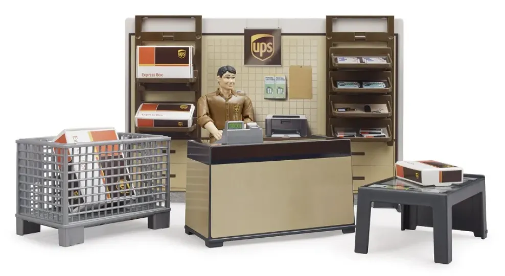 UPS, one of the world’s leading package delivery companies, not only offers its customers pure parcel shipping. UPS stores offer customers a wide range of services including print services, mailboxes and, of course, UPS’ global shipping solutions. There is now a UPS store from BRUDER with equipment and figure. Here, parcels can be picked up and dropped off, shipping boxes purchased and other services used. The employee included in the set will be happy to help. The UPS store is the perfect addition to the UPS vehicles from Mercedes (item no. 02538), Mack (item no. 02828) and Scania (item no. 03581) already in the BRUDER range. And of course, the UPS parcel shop is easy to combine with the other bworld themed sets.