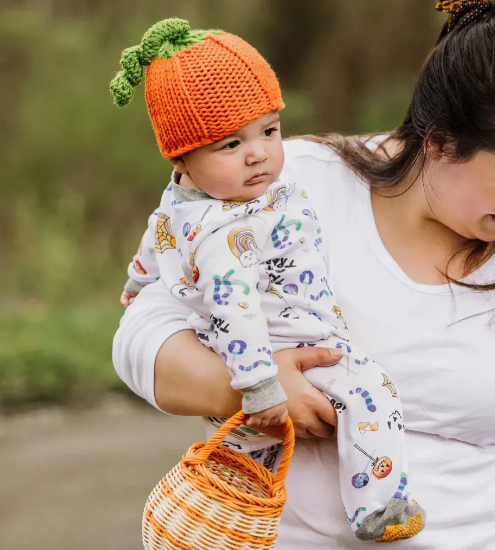 Only treats here! Your little bee will be in ultimate comfort and the Halloween spirit in our handpainted Halloween Treat pajamas!