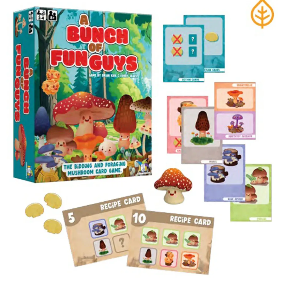In the mycological bidding game A Bunch of Fun Guys, players use foraging cards to collect mushroom cards to fulfill recipes. Do you want to get only one mushroom but have first pick of the choicest truffles? Or are you willing to take whatever is leftover for a chance at three mushrooms — or even four? Some mushrooms will let you take special actions when you collect them. Complete the most recipes to win!
