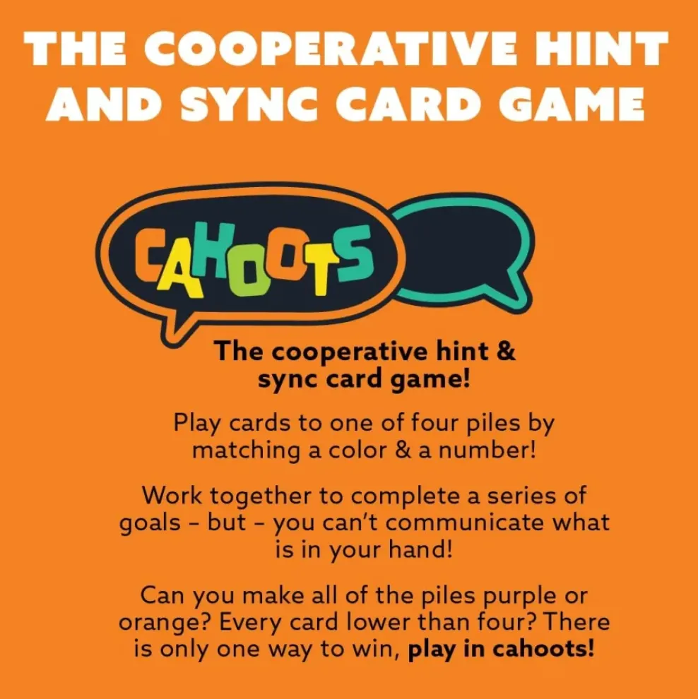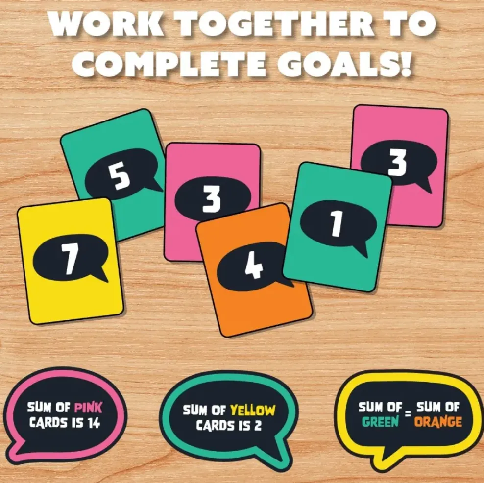 Work together to complete a series of goals – but – you can’t communicate what is in your hand!