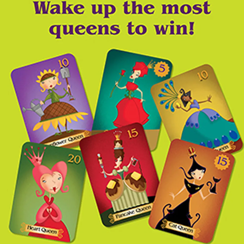Rise and Shine! The Pancake Queen, the Ladybug Queen and ten of their closest friends have fallen under a sleeping spell and it’s your job to wake them up. Use strategy, quick thinking and a little luck to rouse these napping nobles from their royal slumbers. Play a knight to steal a queen or take a chance on a juggling jester. But watch out for wicked potions and dastardly dragons! The player who wakes the most queens wins.