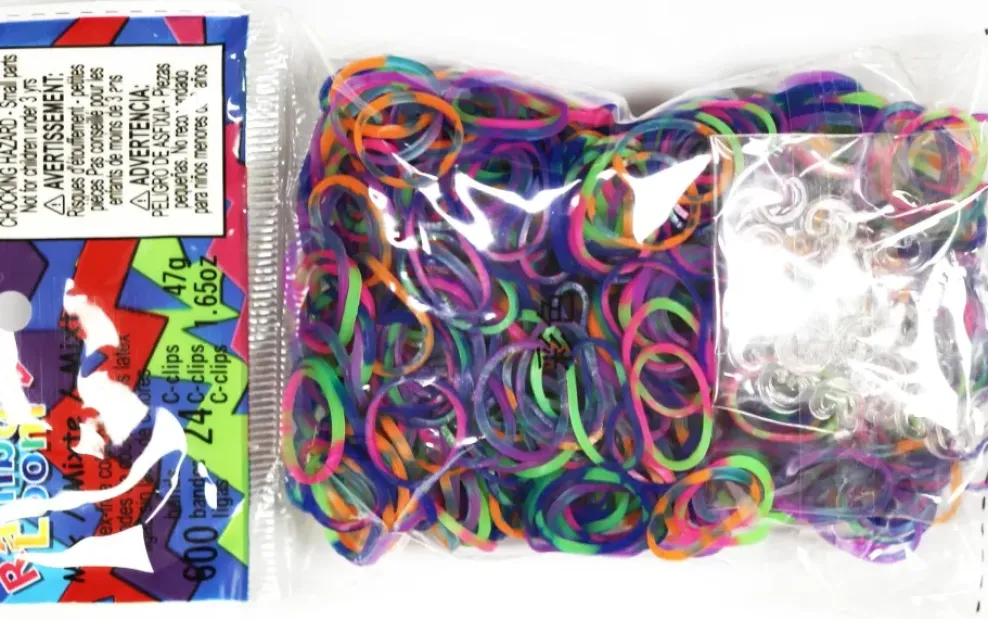 Mixed/assorted tie-dye (jelly). Colors may vary. 600+ non-latex rubber bands & a bag of 24 C-clips.