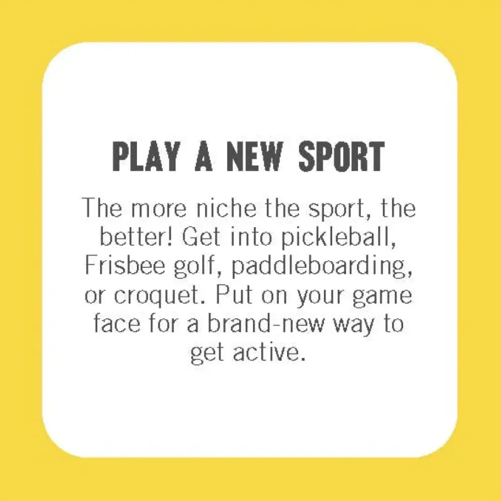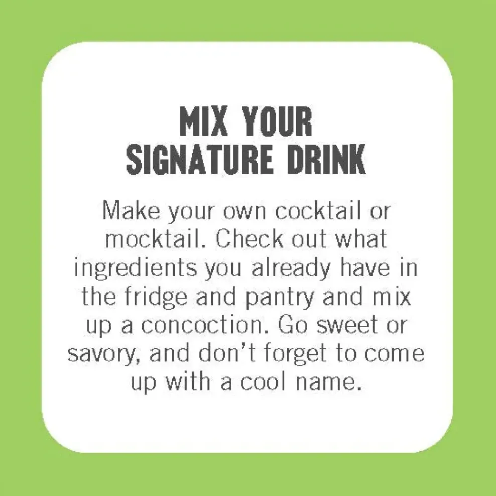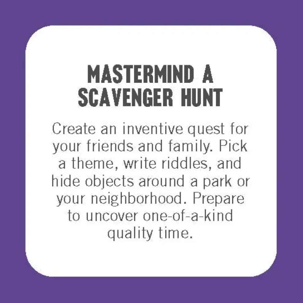 A deck full of suggestions for offline, screen-free entertainment: From outdoor activities to staycation fun to ideas for going out for fun with friends, this deck offers a variety of ways to stay entertained without needing to check your phone or even bring it with you!