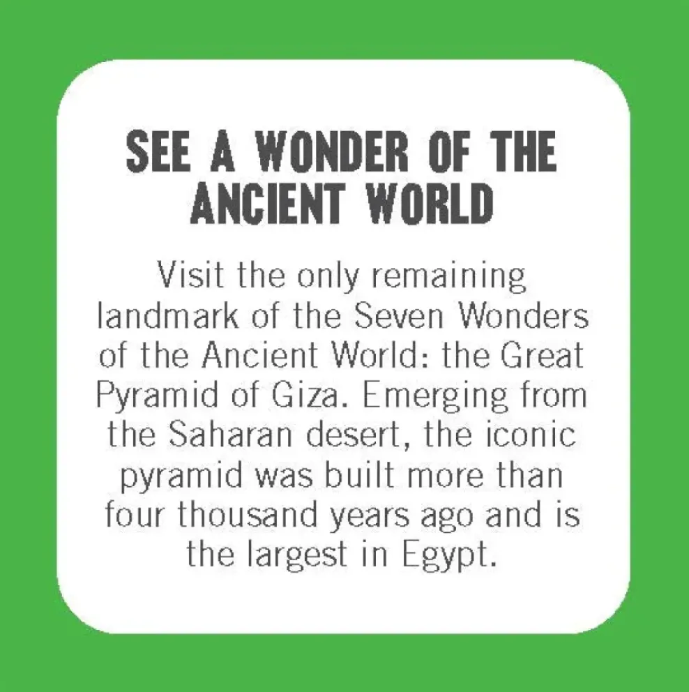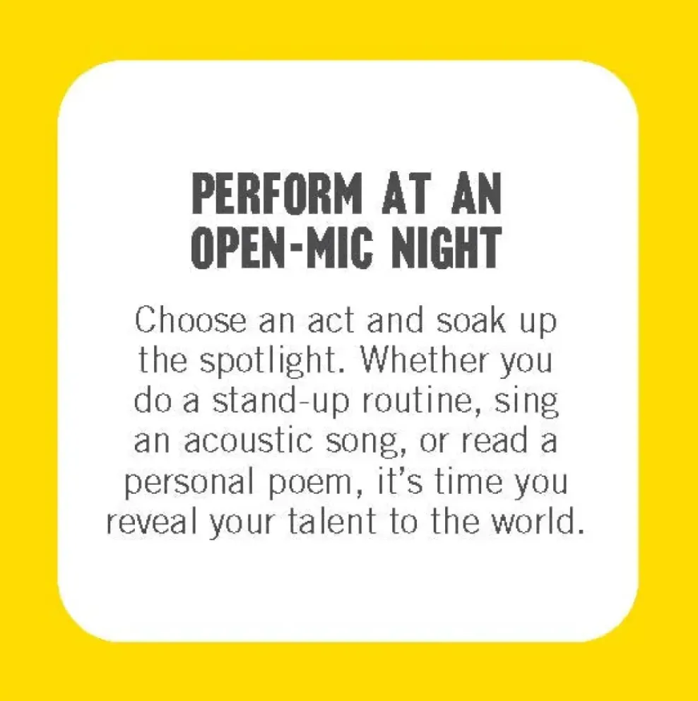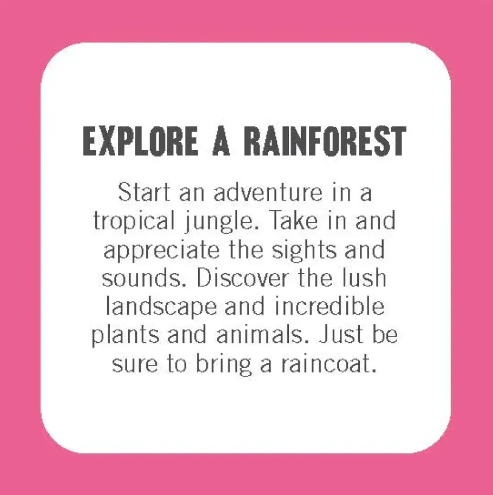 The activities on the cards are exciting, thrilling, and awe-inspiring. The range of categories includes spending time in nature (deep-sea dive, meditate by a waterfall), thrill-seeking (sky dive, learn to ride a motorcycle, taste a hot pepper), aspirational travel (visit the oldest city you can, travel somewhere during a major local festival), learning something unusual (take instrument lessons, learn a language picked at random), or trying something to push out of a comfort zone (audition for a theater production). Some activities require travel, but many can be done from home.