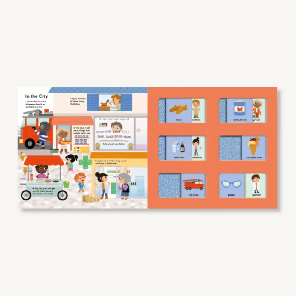 Who gathers honey? Who designs clothes? Who makes lunch for students? So many jobs can be found in this delightful and satisfying sliding panel format for preschoolers. The 36 panels feature jobs in various settings: in the orchestra, at the market, at school, and more! Each new spread offers clues to the right responses and provides bite-size information. Slide the panels to reveal the answers. It’s match-and-learn fun for preschoolers!
