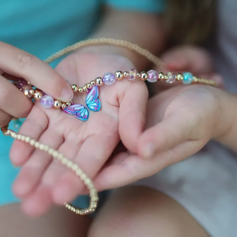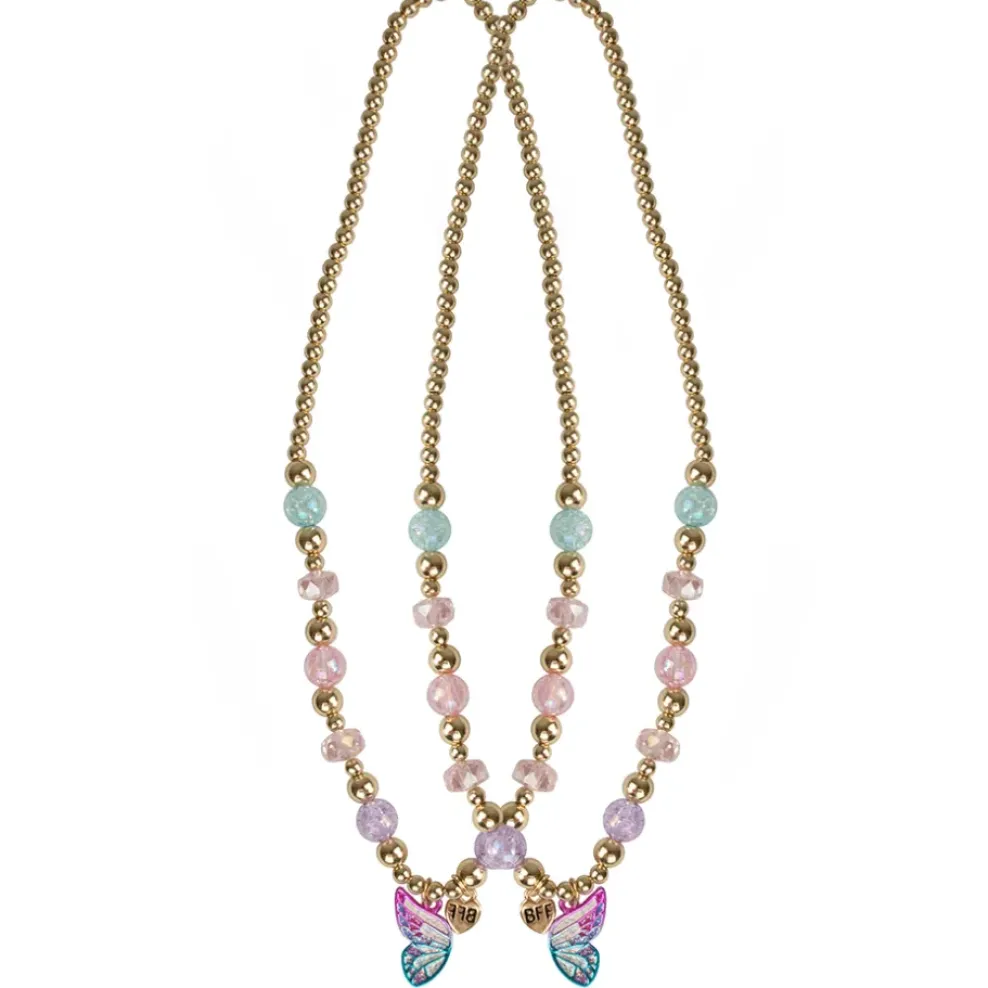 Share the love with your bestie with our Butterfly Wishes BFF necklaces! This set includes two gold toned beaded necklaces, with half a butterfly pendant with a gold BFF heart on each. Our children’s jewelry is strung with double the elastic to add extra durability.