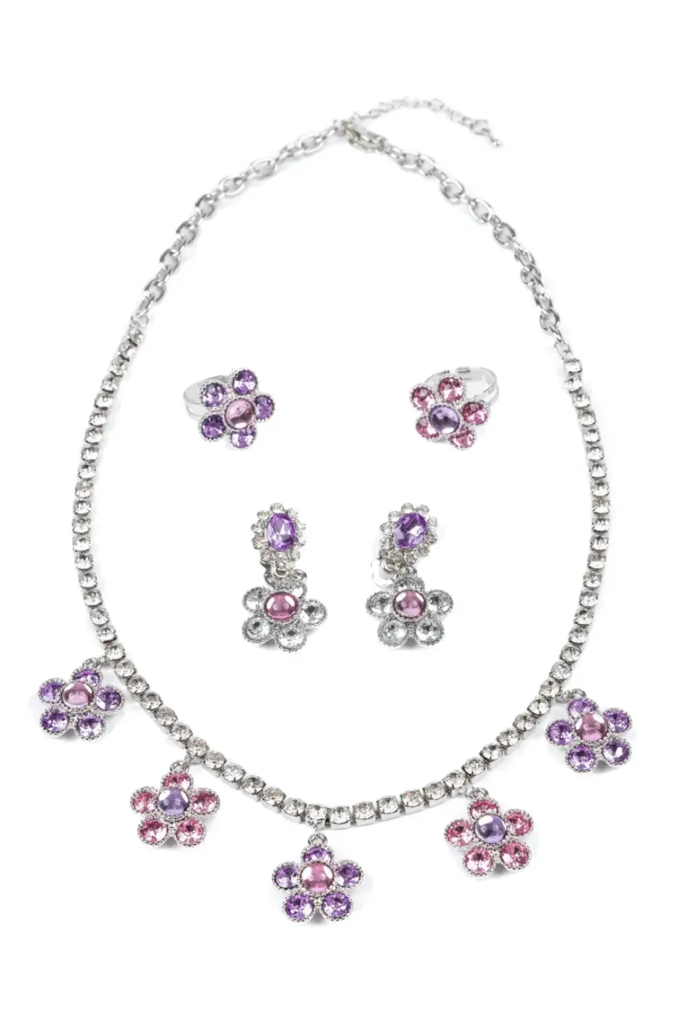 Sweet meets sophistication in The Audrey 5-piece jewelry set. This elegant boxed set includes two rings, a pair of clip-on earrings, and a matching necklace, all accented by floral-shaped charms and studded with soft pink, diamond, and lilac colored gems.
