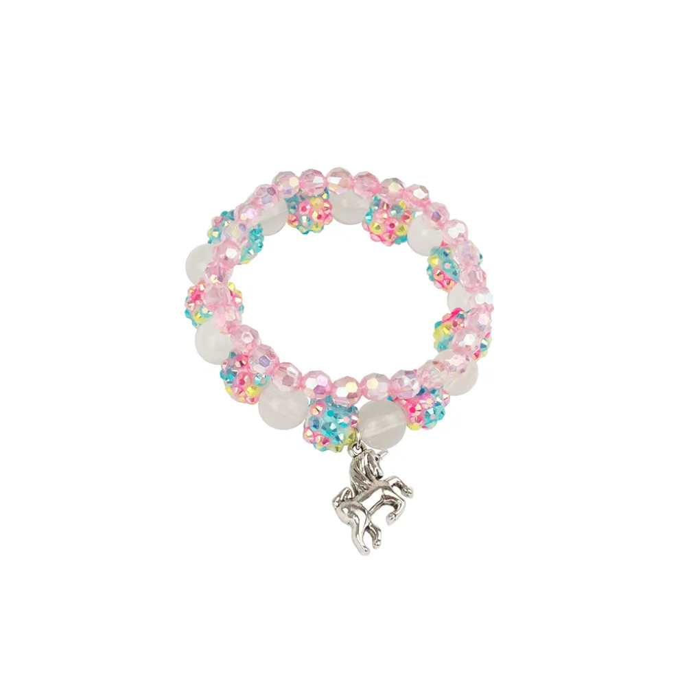 Our Sparkle Pony Bracelet set is just as it sounds! Made with rainbow crystal beads, translucent white beads & finished with a silver unicorn charm this set is sure to be eye catching! Pair it with its matching translucent pink bracelet to complete the look! Our children’s jewelry is strung with double the elastic to add extra durability.