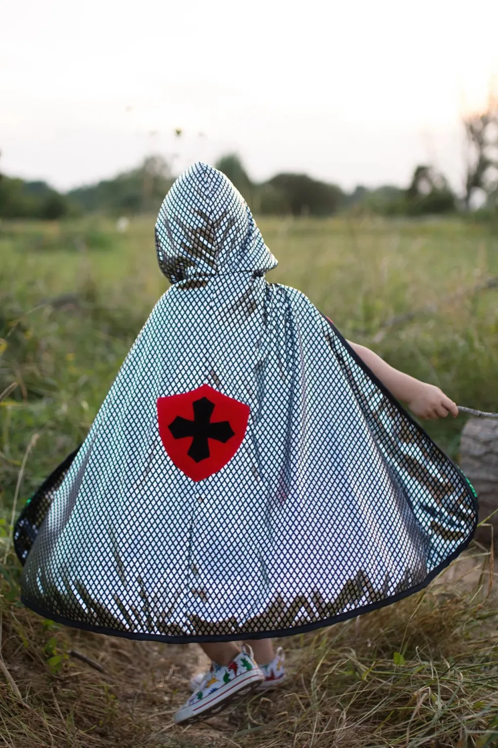 Whether you are fighting dragons or being the dragon, this reversible cape offers plenty of enchanted fun for everyone. You can pick from two characters with this liquid knit, shiny green side for the dragon in you, and a shiny silver shield emblem on the other side for the Knight in you. The Velcro closure at the neck makes switching medieval characters a breeze.