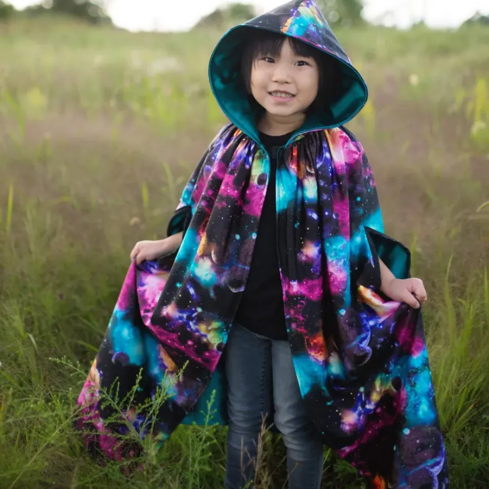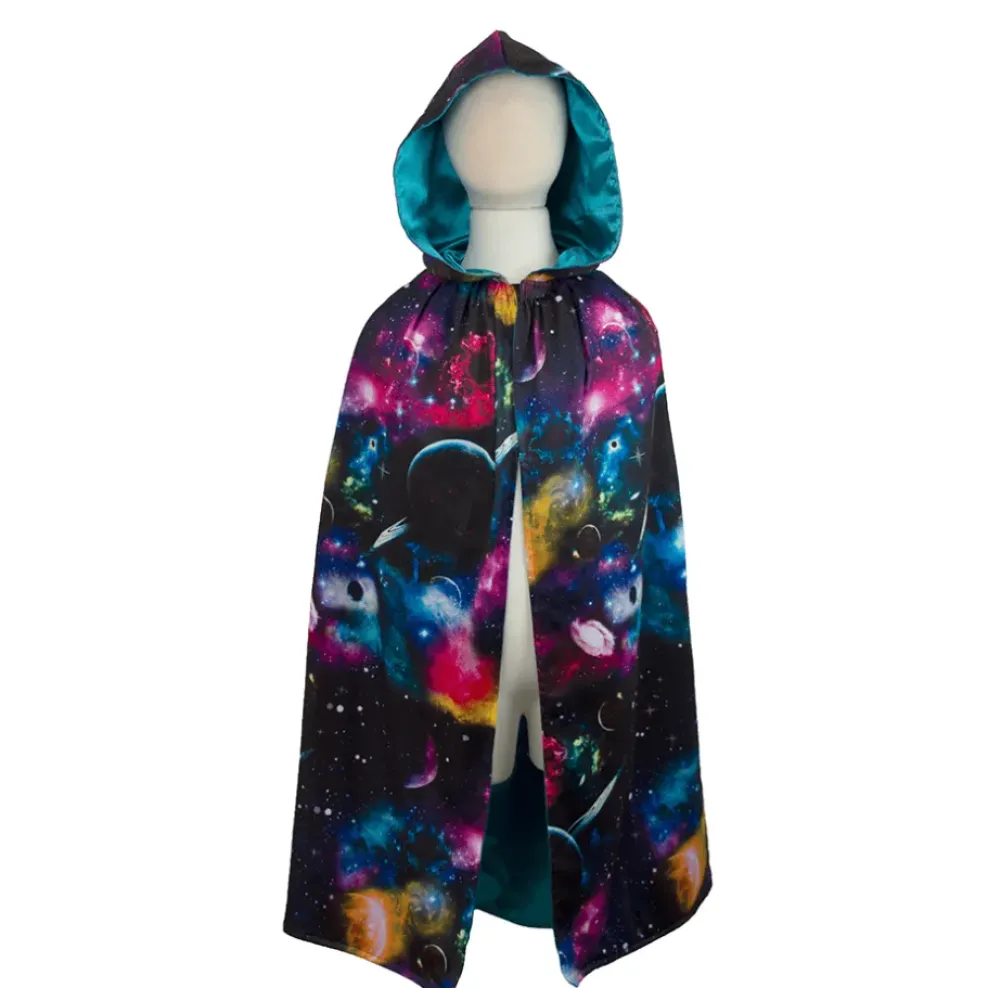 This floor-length cloak is out of this world! Our Galaxy printed cloak is made with vivid & bright colours, and is unlike any other costume we have! This cloak is lined with teal satin with a velcro collar and oversized hood.