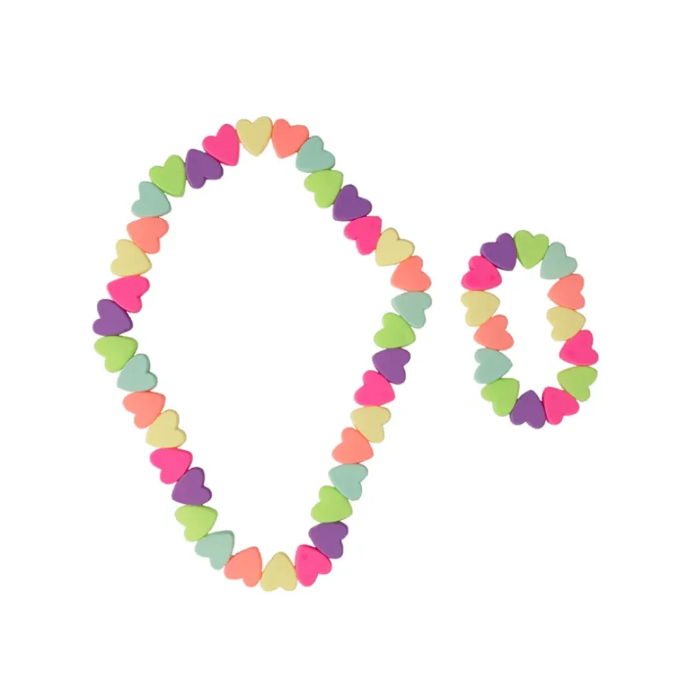 Sweet Tart Heart Necklace and Bracelet set is made with matte neon hearts designed to resemble the classic candy hearts. Perfect for your little valentine! Our children’s jewelry is strung with double elastic to add extra durability.