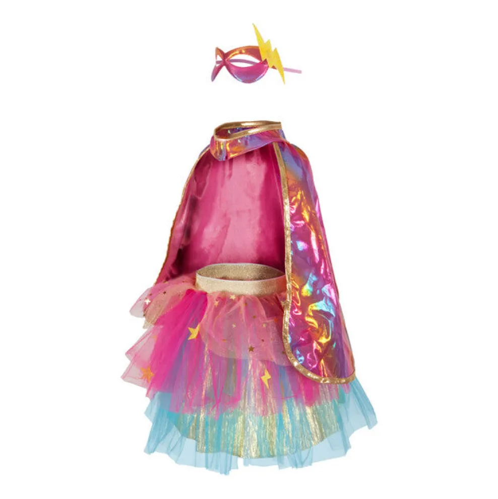 Your mini will love this amazing three piece set! These designs could be superhero or rock star outfits! Waistbands are fabric wrapped for a nice finish & comfort (no scratching here). The emblems on the back of the capes are embroidered around the edges for a nice finish. The copper/teal cape has a teal satin lightning bolt on the back! The cape is lined for a complete elegant finish. There are star and lightning bolt accents on the skirts with a small pc of round felt on the back to hold them securely to the tulle. The edges may lift off but that is part of the effect for a 2D look! The skirts have a peplum and two layers of tulle with a fantastic crinkle metallic bottom lining layer. The masks are double sided and have a lightning bolt feature to match the set perfectly.