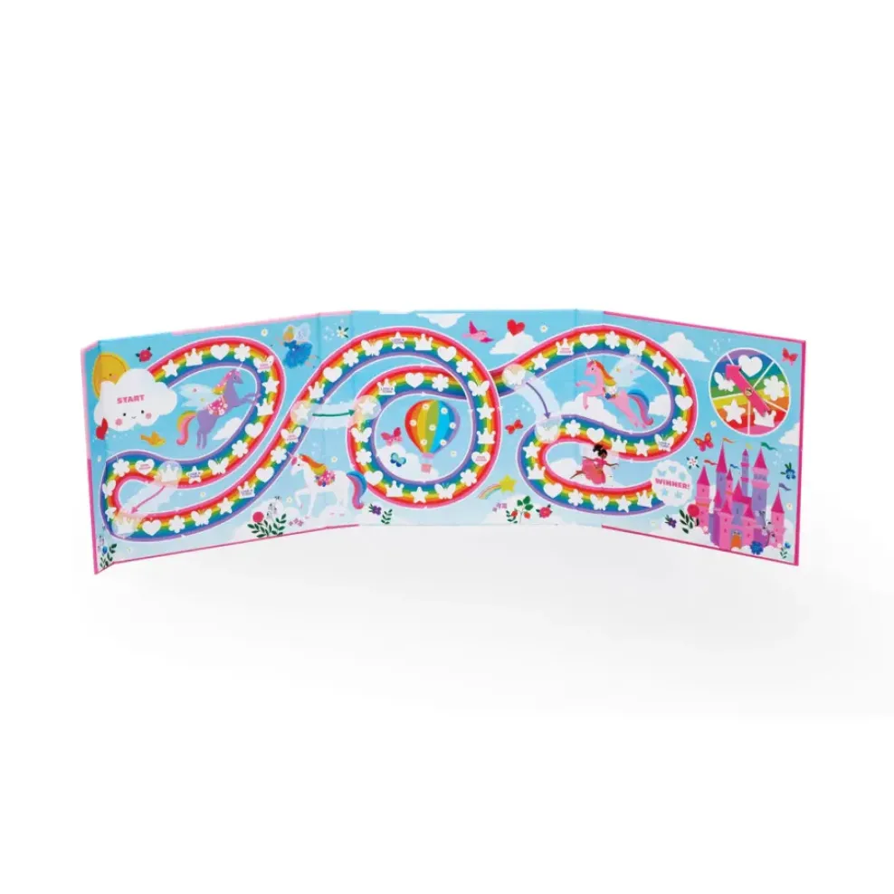 Folds up easily for on the go fun! Tri-fold magnetic board includes 6 magnetic play pieces and a built-in spinner.