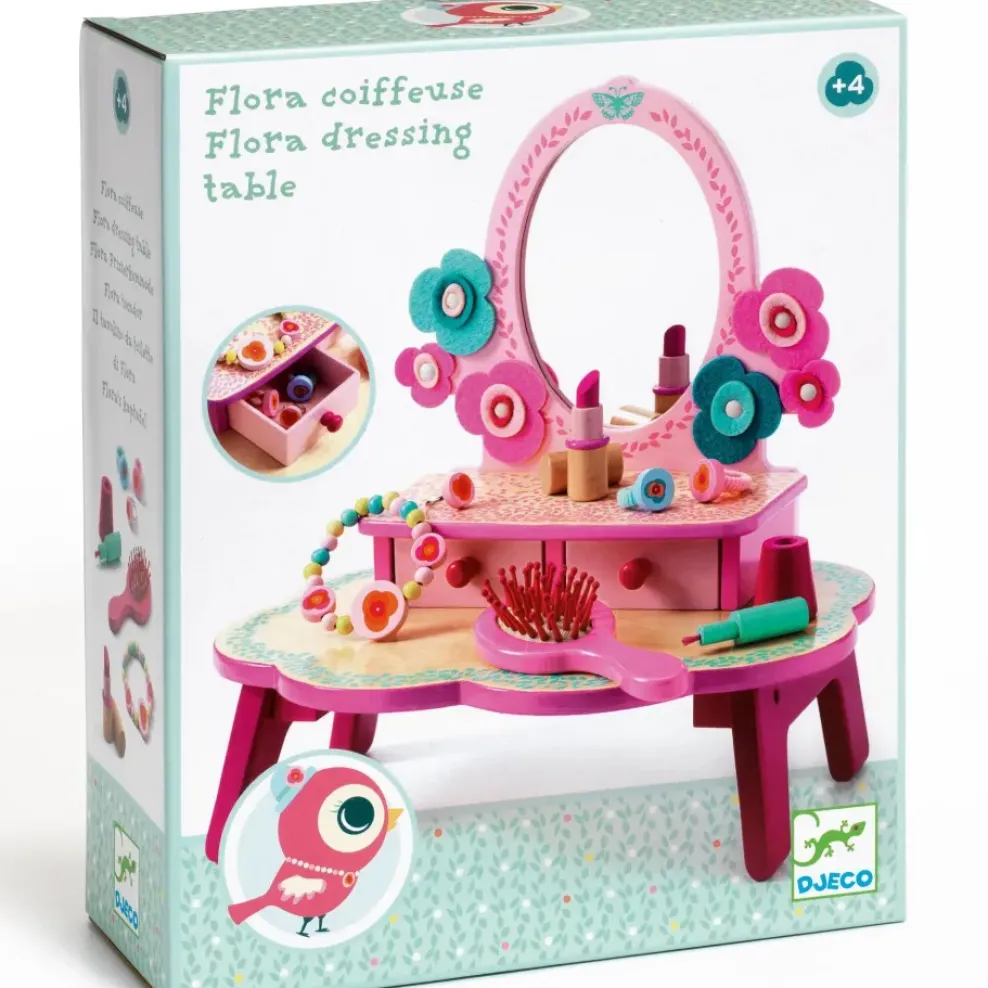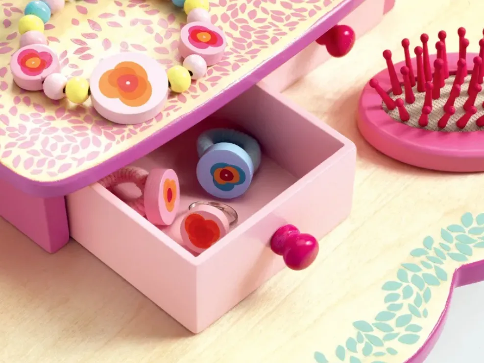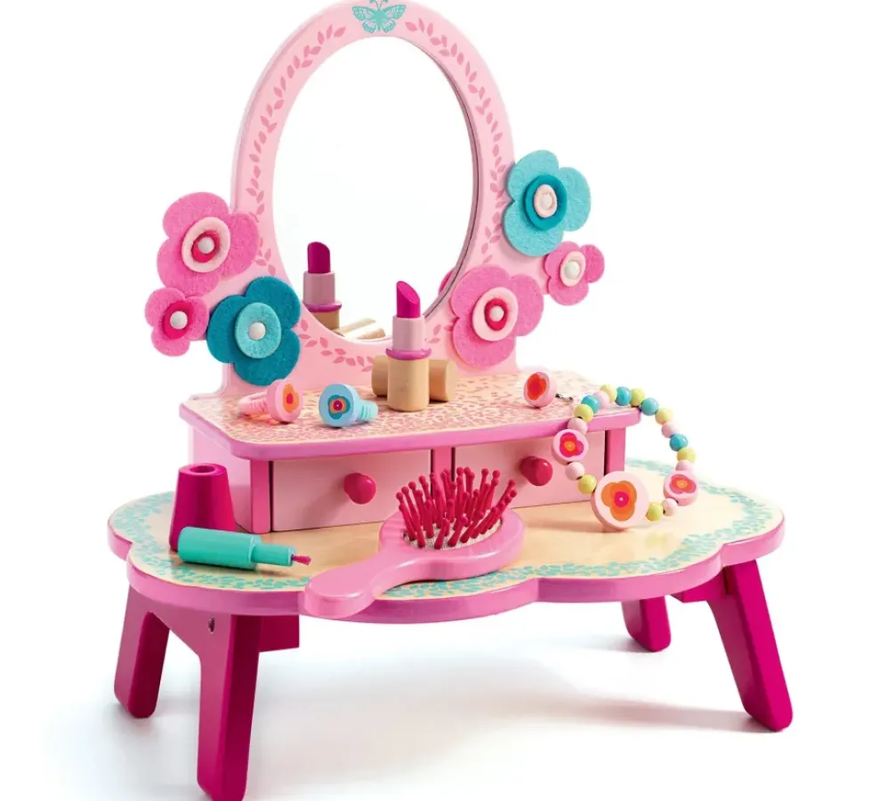 Contents: 1 wood and felt dressing table with mirror, 1 lipstick, 1 nail varnish, 1 hairbrush, 1 bracelet, 1 ring, and 2 scrunchies made of wood, felt, metal and plastic.
