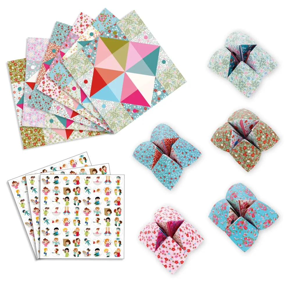 Say a number… Pick a color… This is a playground classic! With this origami set, you can make 24 fortune tellers to play with your friends. Sheets with jolly prints, to be folded in simple steps that are clearly explained in the instruction booklet, as well as 3 sheets of fun forfeit stickers to place under the flaps make for hours of fun!