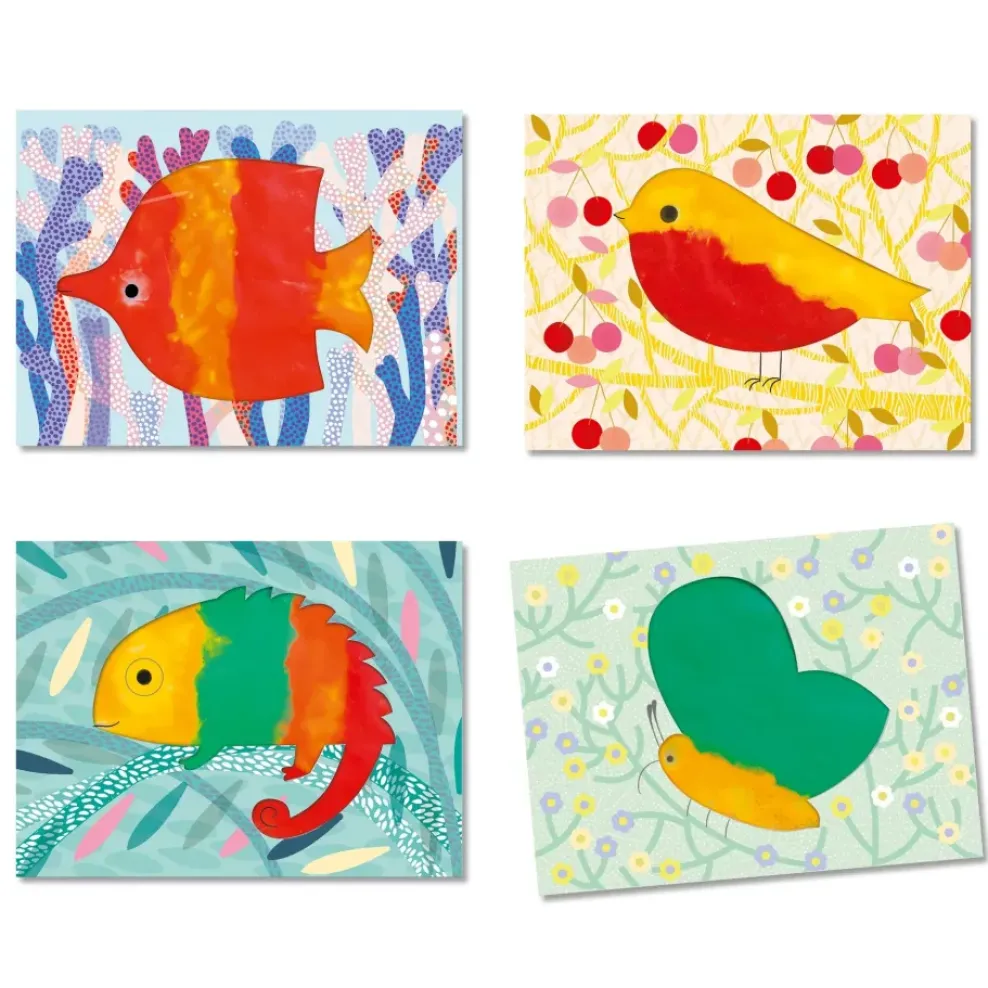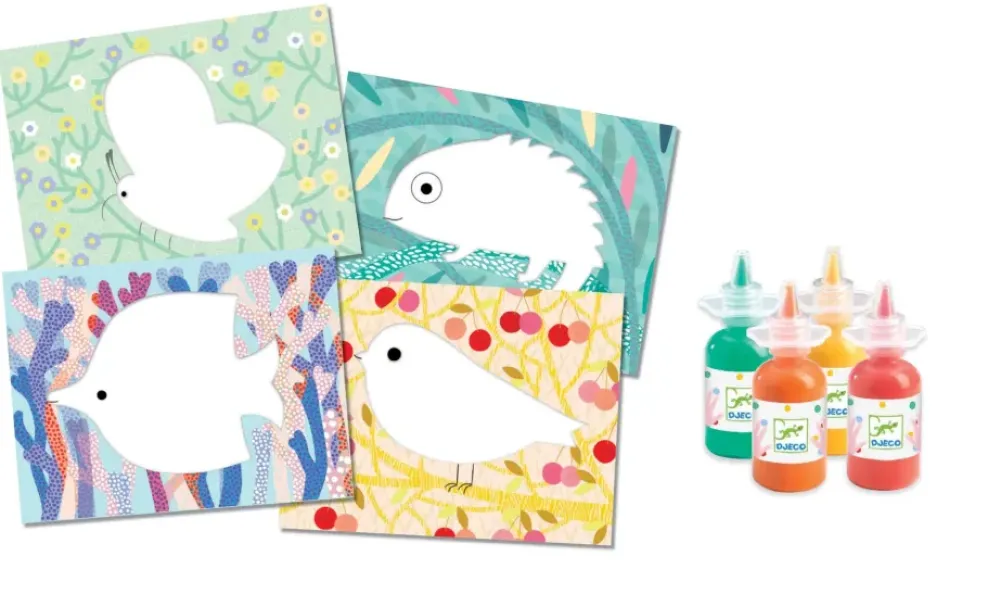 A no-mess painting starter kit specially designed for young children (18 months plus). Children open the plastic sleeves, pour in the paint, and seal them up again. Then comes the fun part! They smear the paint around, without getting their hands mucky, and color in a beautiful fish. It’s magic! With a little bit of soap and water, the paint rinses off the plastic sleeves and the fun starts all over again.