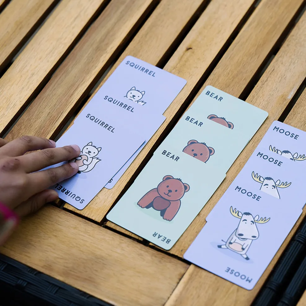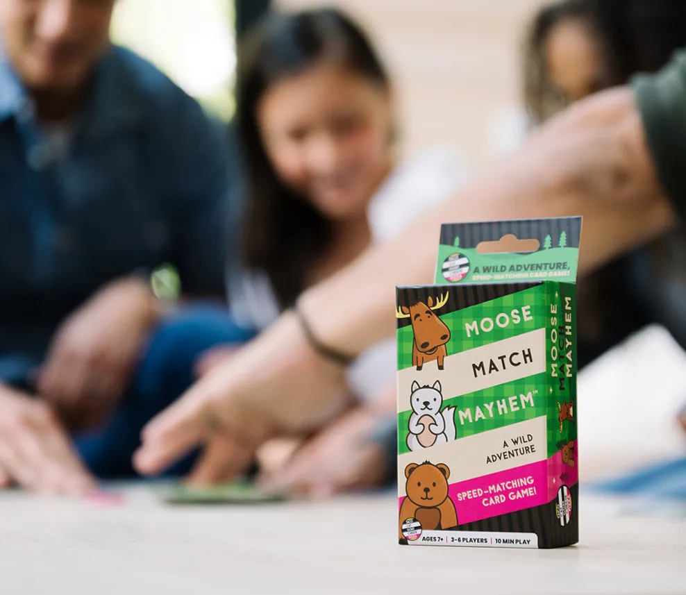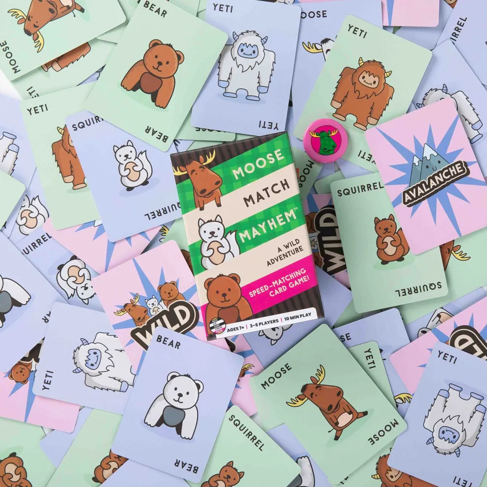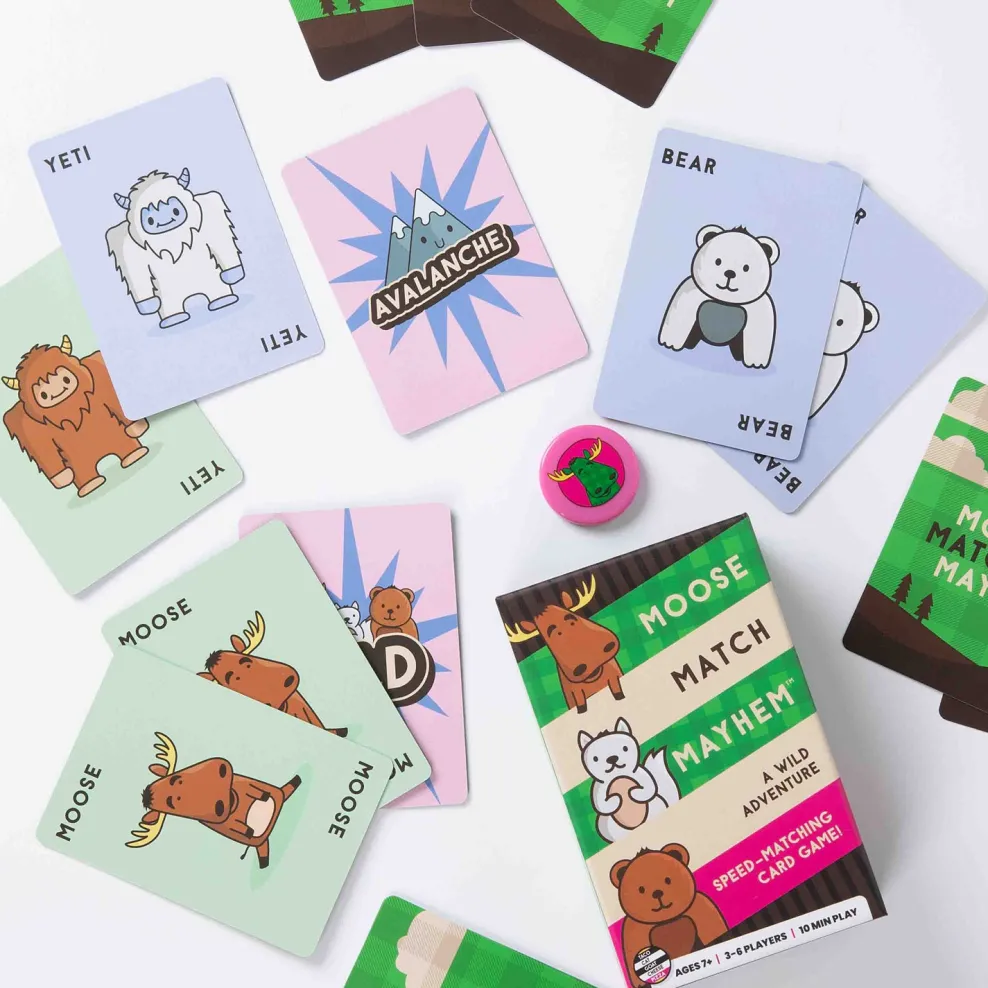 Each player takes a card from the stack. Everyone chants “Moose! Match! Mayhem!” flips their card over and races to grab the best card to make a match. The first player to collect three sets of animals wins!
