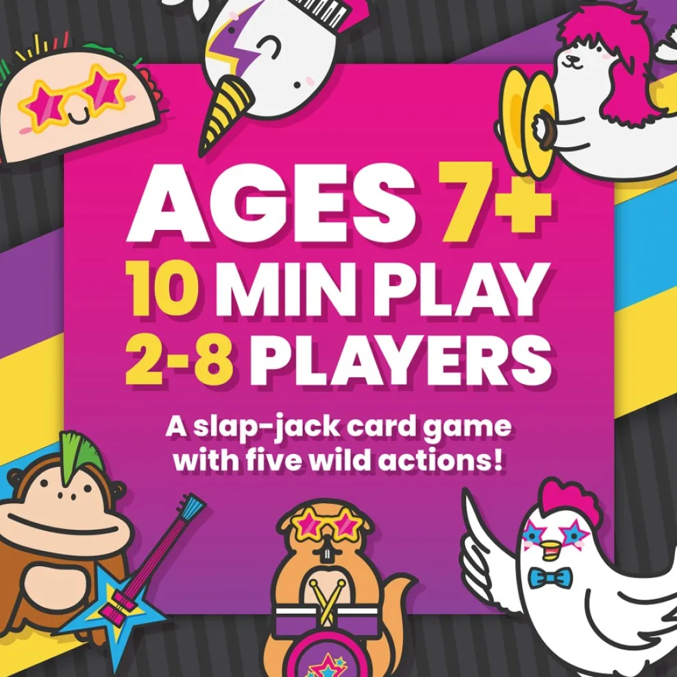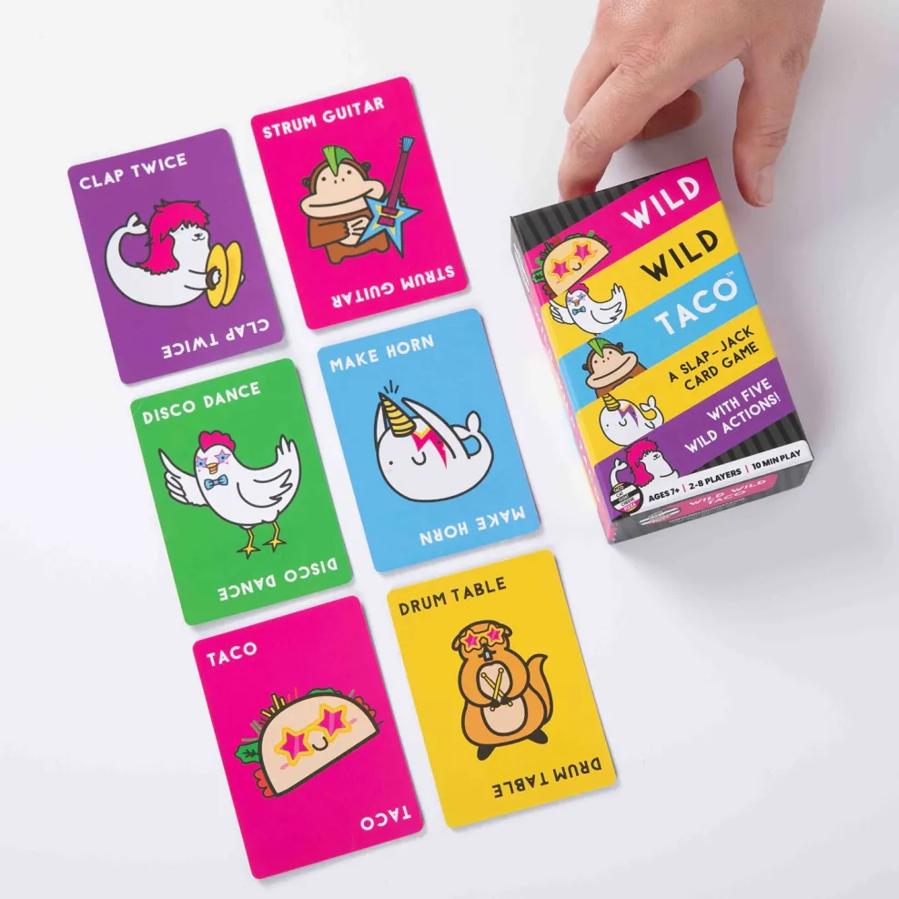 Players take turns flipping over their card while saying, “Wild, Wild, Taco!” When a card played matches the one before it, everyone does the corresponding action and races to slap the pile. The first to get rid of all their cards wins!