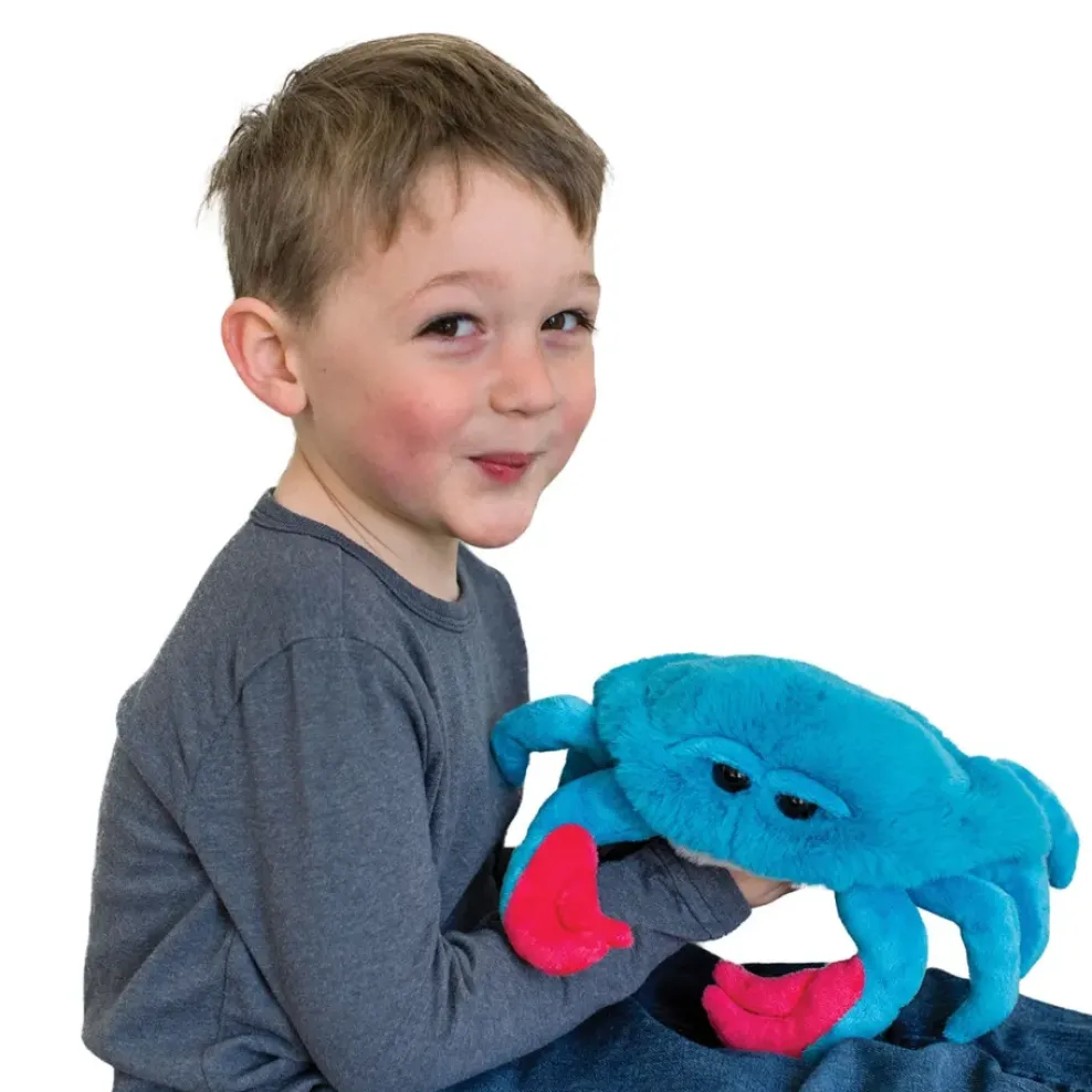 Look into the warm waters of the Chesapeake Bay and you might see our happy Blue Crab stuffed animal, Chesa, picking her way along its sandy bottoms! This famous crab species is known for its bright, blue hue and red tipped claws. Chesa showcases these features with vibrant colors and delectably soft plush materials. Eight legs extend from under her carapace while she holds her bright claws in front of her, ready to snap up anything that looks good to eat. Her easy-going expression is accentuated by folded fabric eyebrows over her shiny, black eyes. Make a splash and celebrate every warm, summer day with Chesa the Blue Crab plush!