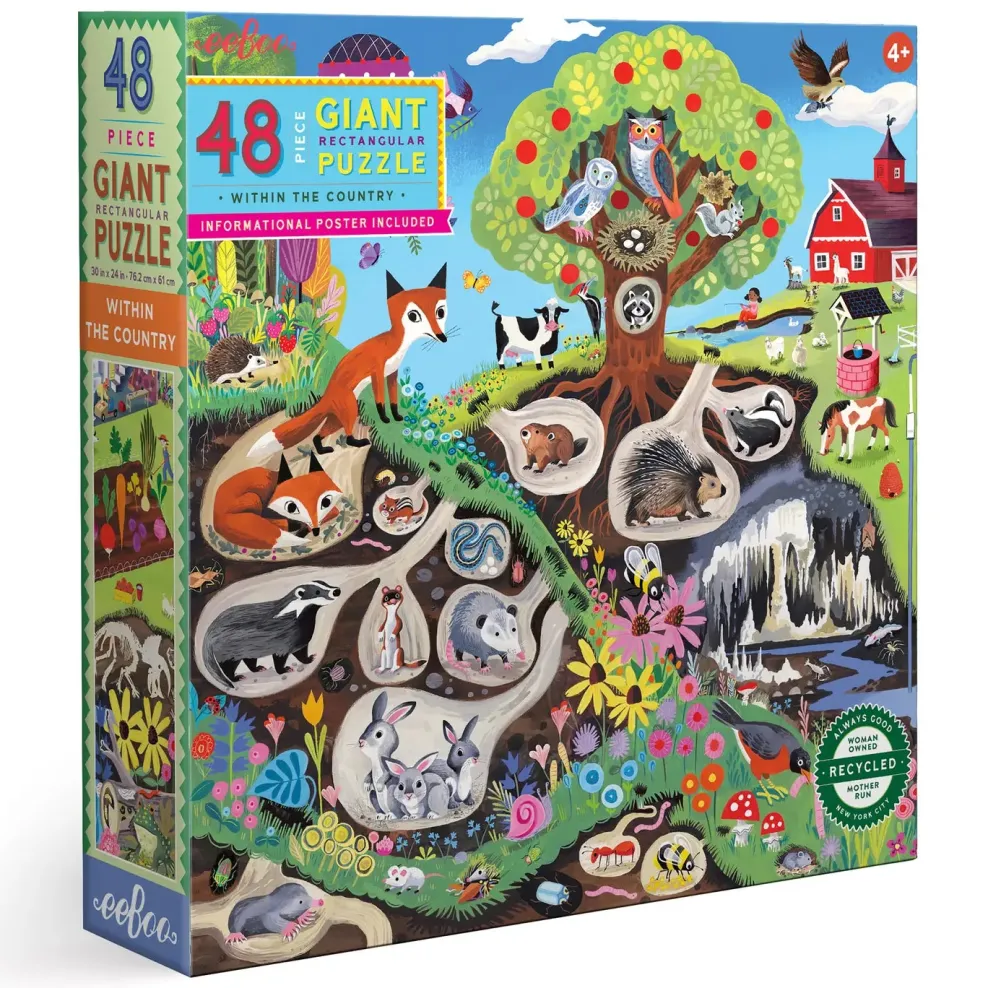 Overhead, trees blossom and birds fly, while underground, animals burrow: the subtleties of farming are revealed alongside inside views of a basement revealing pipes and boiler, even hidden fossils. Everything is carefully labeled on an amply sized poster included with the puzzle. The intelligent and fanciful artist Linda Bleck has created this enormous puzzle. Filled to capacity with detail and delightful moments of discovery, it covers new ground in the floor puzzle category, making this format both a fully educational activity and a rich individual play experience.