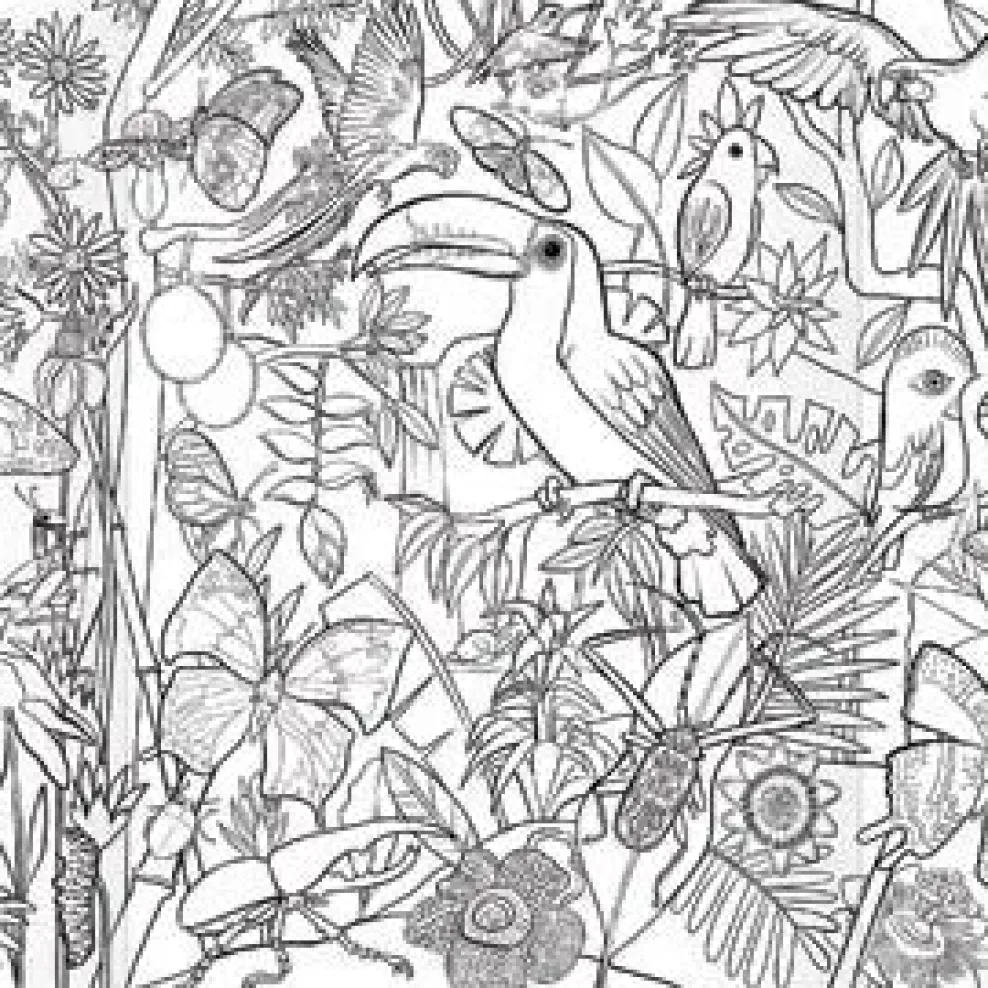 8 high Quality, double-sided colored pencils offering 16 vivid colors bundled with an intricate fold-out coloring mural teeming with birds and butterflies and details by illustrator Linda Bleck