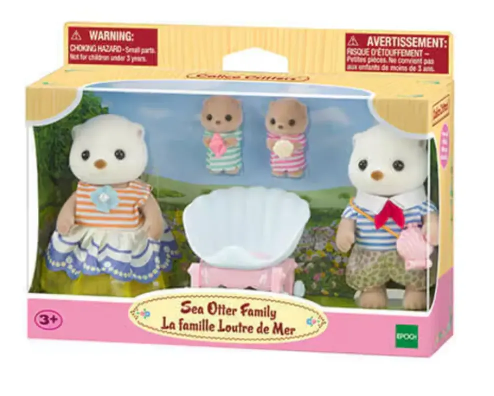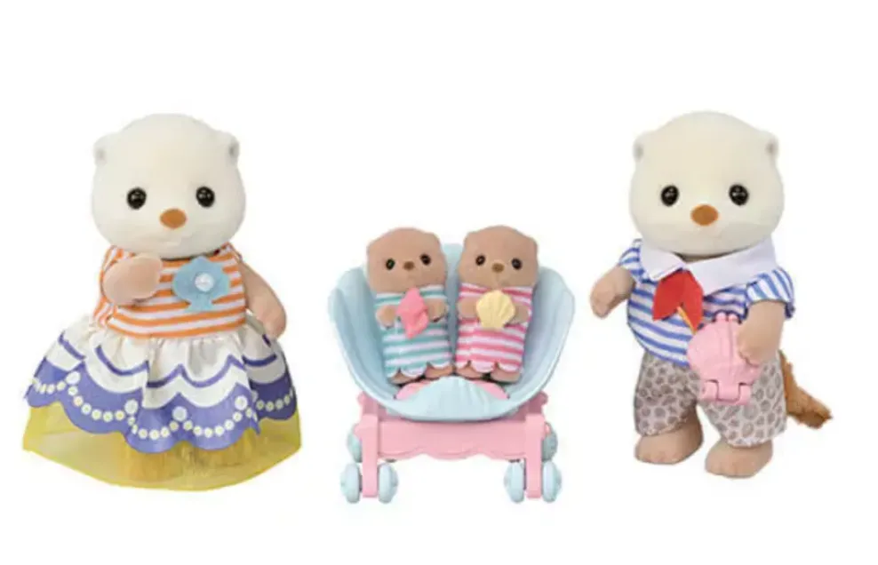 The Sea Otter family are adorable round characters with small ears and diamond-shaped noses. This set includes the mother, father and cradled babies wearing outfits with a shell motif, with a pram and a shoulder bag. The two cradled babies can ride in the shell pram. The shoulder bag opens and closes, and has a pearl inside. The cradled babies are holding their favorite shells.