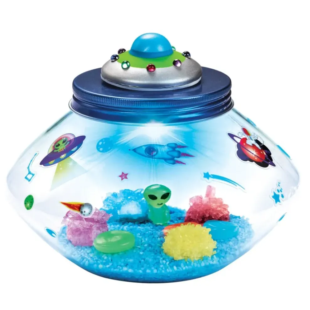 Your complete set includes; ready-to-grow crystals, crystal powder, sparkling space rocks, a squishy UFO, space gems and colorful stickers.