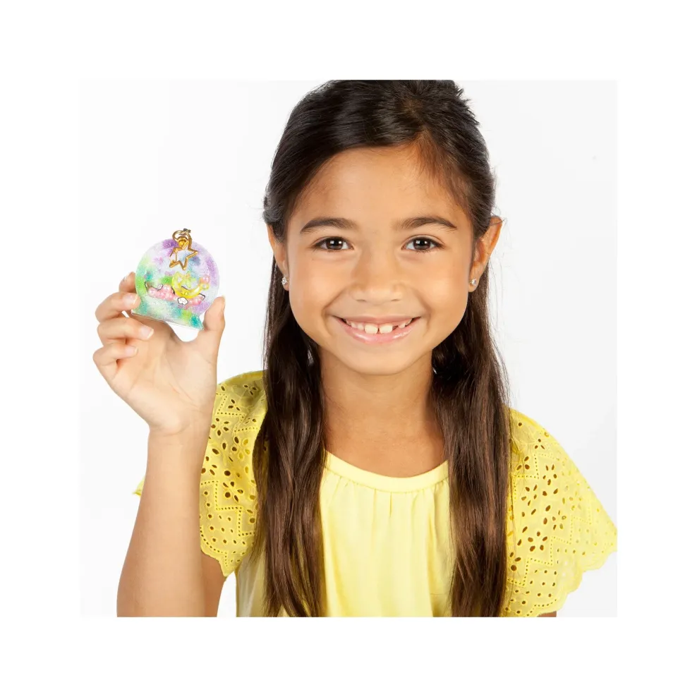 DIY Sensory Fidget craft kit comes with resin, 3 silicone molds, 3 plastic covers, 4 colors of glitter, glue, beads & fillers, cherry charm, moon charm, crystal charm, 3 shaped keychains, measuring cup, stir sticks, jump rings, leaf findings, sand paper and illustrated instructions
