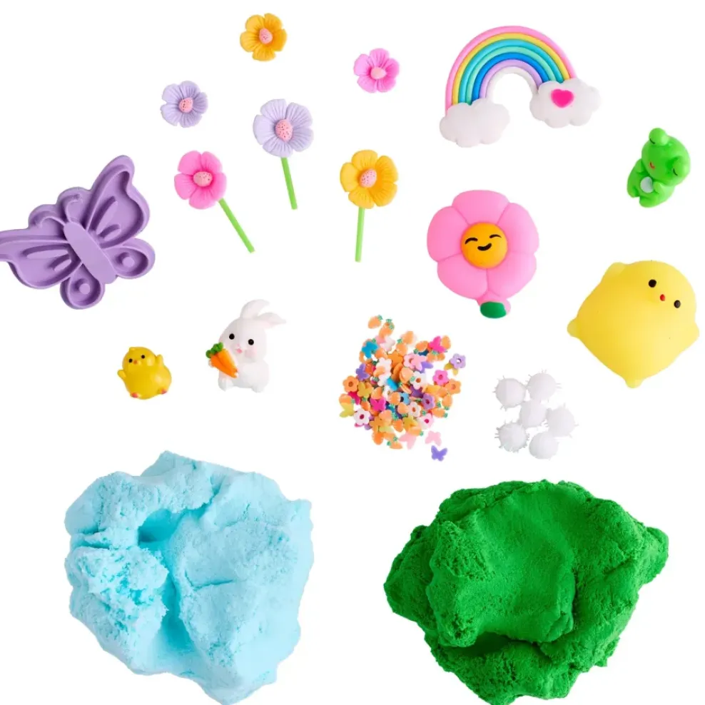 Contents Include: 2 colors of Cloud Clay Net Wt 0.2 lb (90 g) total, 3 figurines (bunny, frog, and chick), 6 faux flowers, squishy flower, squishy chick, pom poms, rainbow, butterfly stamp, garden confetti, and instructions. Contents may vary
