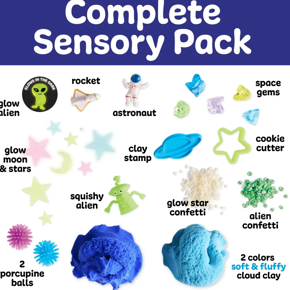 With Sensory Pack Outer Space and space-themed components, toddlers will engage the senses and build fine motor skills, as they explore all of the textures, colors and shapes. This sensory play activity features two colors of super-soft, lightweight, stretchy cloud clay, offering endless squishing, stretching, stamping, and molding fun. Cloud clay is perfect for little hands, remaining pliable and never drying out. Plus, glow-in-the-dark aliens, stars and other intriguing space objects enhance the sensory experience, adding an extra layer of excitement.