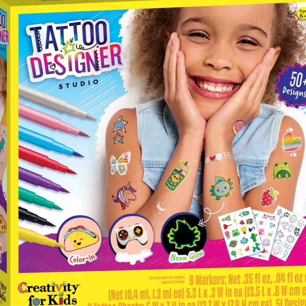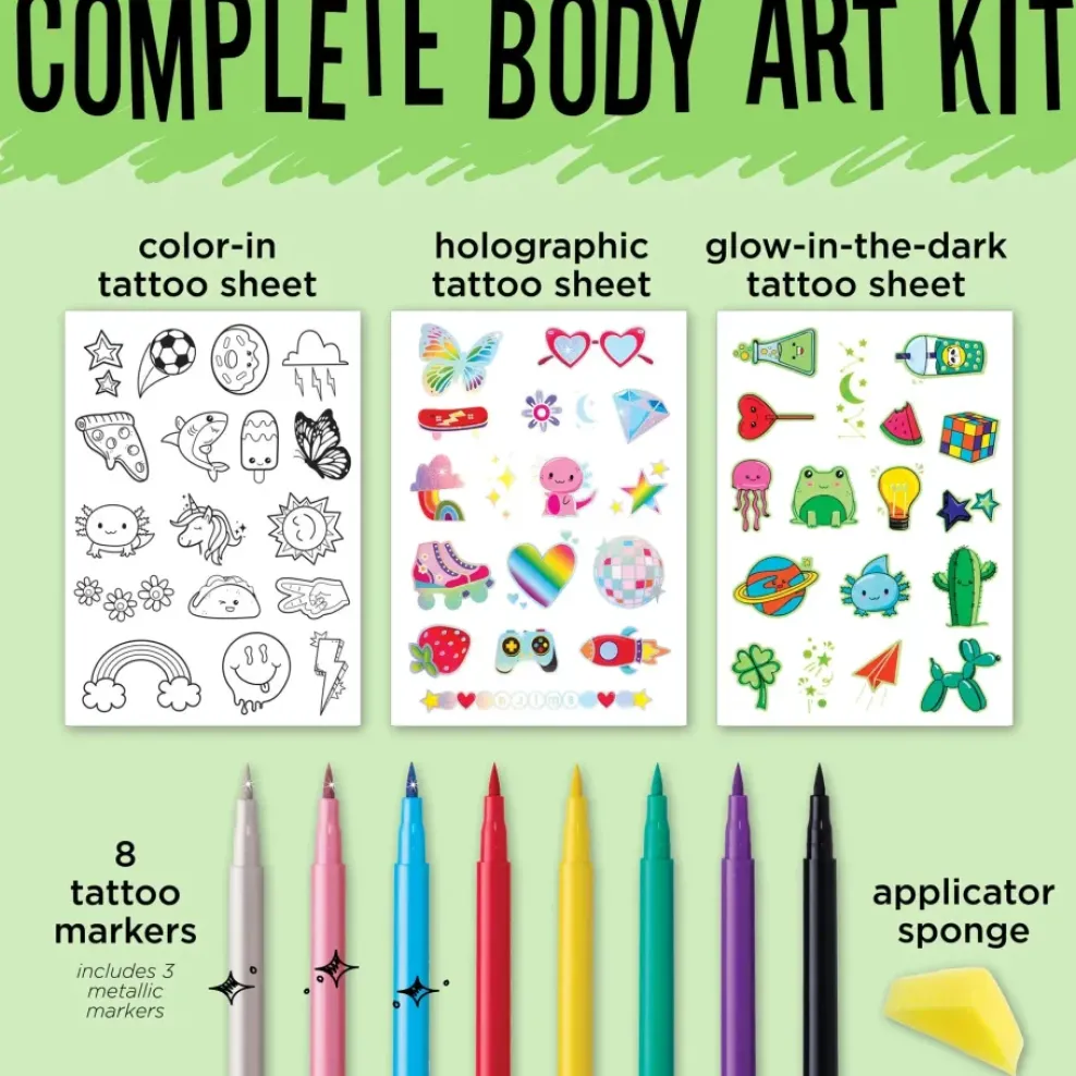 Unleash your inner artist with our Tattoo Designer Studio! Our temporary body art kit features fabulous brush tip tattoo markers and over 50 trendy temporary tattoo designs