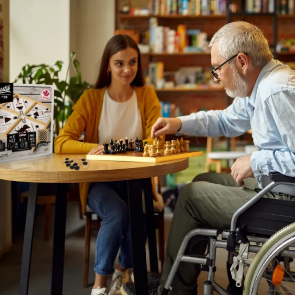 Classic Chess/Checkers is played on one side, then the board flips over for a crazy game of 4-player Sling puck that has participants using the elastic bands to propel their chip through the small channels in the middles into the opposite side. CRAZY!