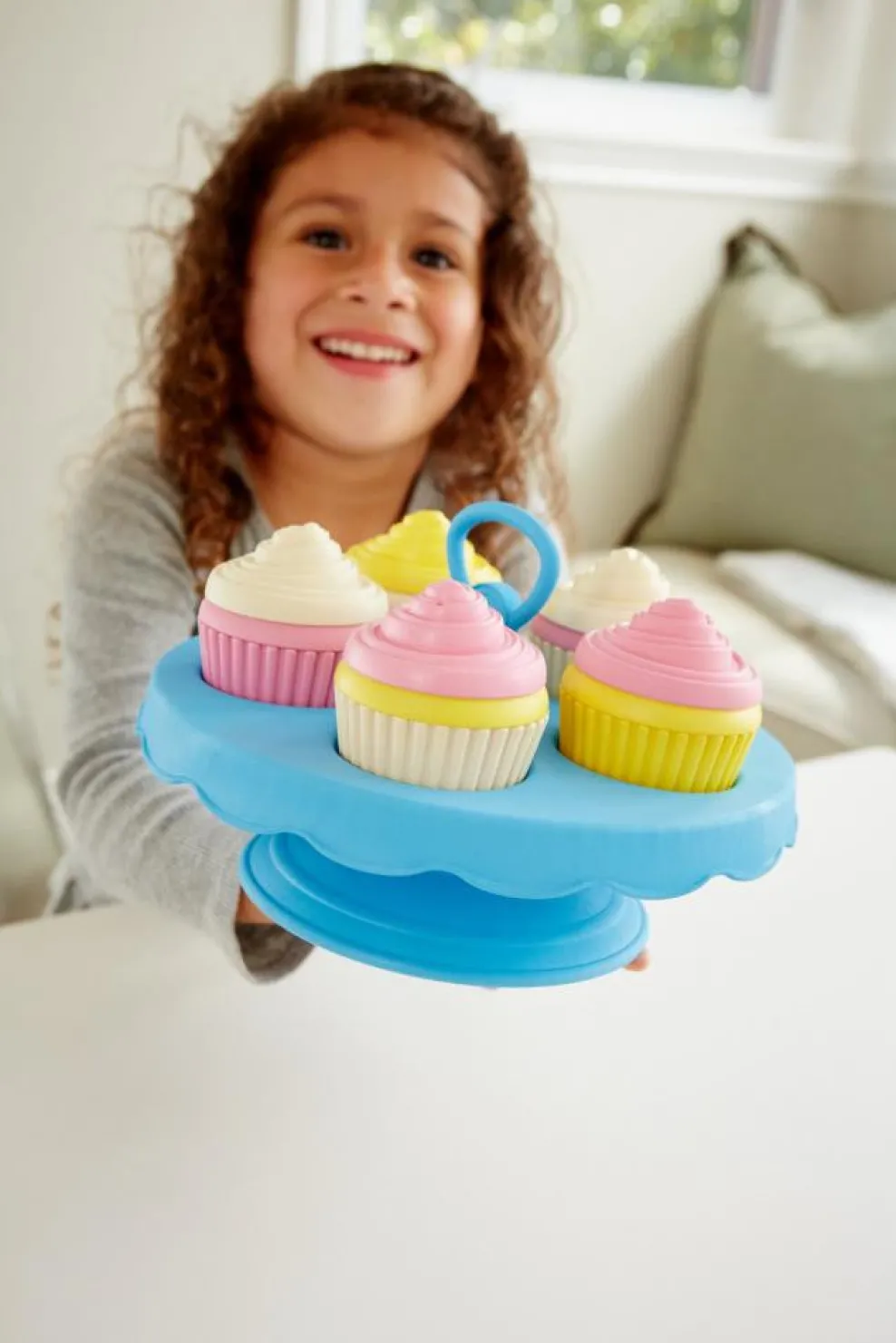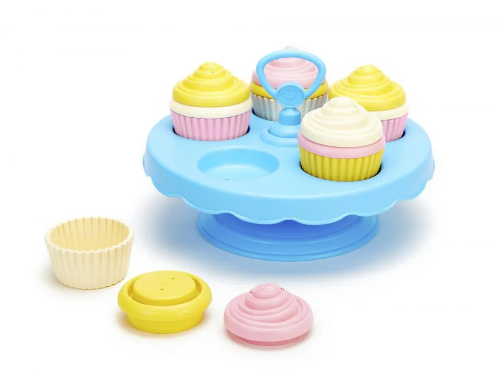 Whip up a batch of sweet treats full of imagination with the Green Toys™ Cupcake Set! Little bakers can practice colors and counting, develop fine motor skills, and host make-believe parties for their stuffed animals and friends. This 16 piece mix-and-match set includes frosting, cakes, and cupcake liners for 5 complete cupcakes, plus a cake stand display. The cake stand is perfect for presentation and storage, and can even be used to serve actual cupcakes. Cupcake pieces are dishwasher safe. Meets FDA food contact standards.