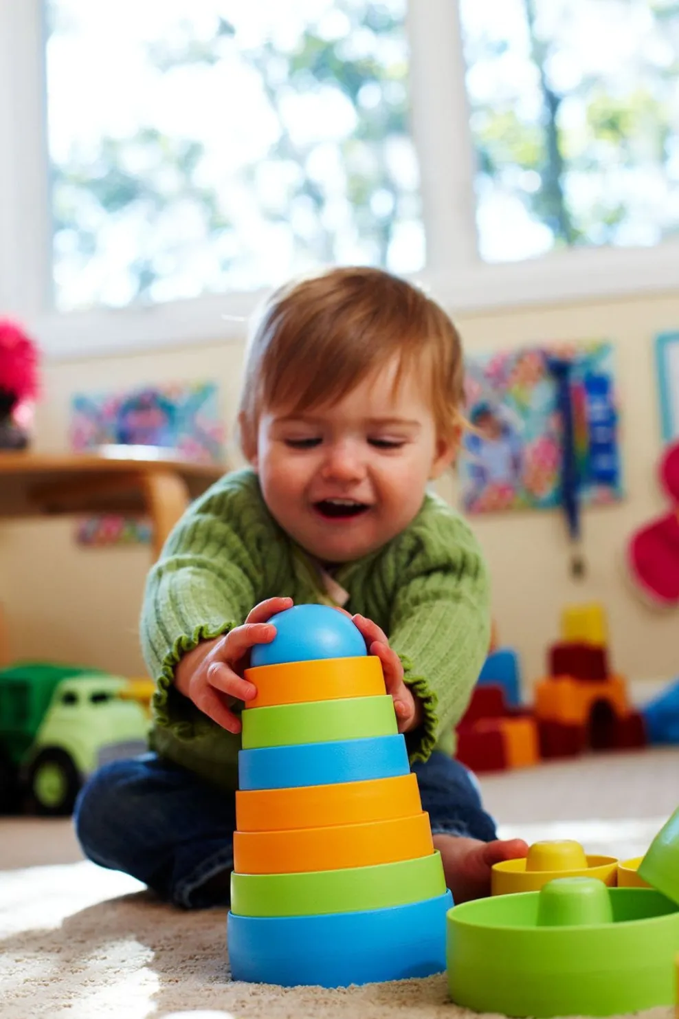 The Green Toys™ Stacker takes a classic toy and makes it safer and more playful. The eight whimsically colored nesting pieces stack easily from large to small, while also allowing little builders to use their imagination and stack in any order. Little ones can develop hand-eye coordination and color recognition while having plenty of Good Green Fun™. Most importantly, the Green Toys Stacker is safe. Its unique design has no center post. This Stacker is made in the USA from 100% recycled plastic milk containers which save energy and reduce greenhouse gas emissions. For ages 6 months and up.