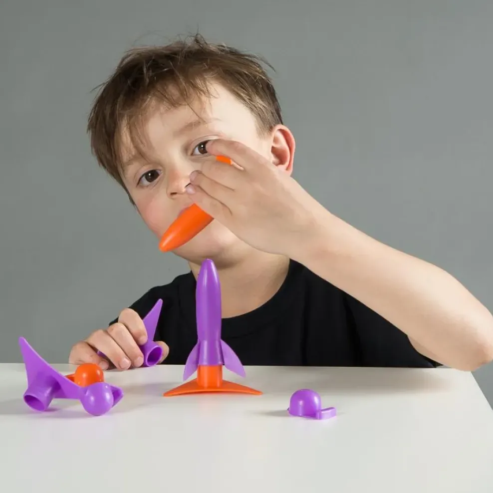 This mini rocket can be launched again and again with the explosive power of bicarb and vinegar. The Fizz Rocket is filled with these 2 household items which create a chemical reaction that makes a build-up of carbon dioxide which shoots out the base of the rocket and shoots the rocket up.