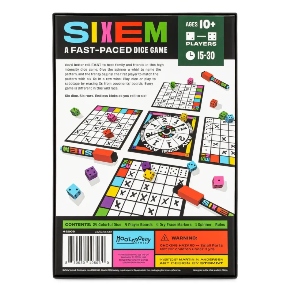 Give the spinner a whirl to name the pattern, and the frenzy begins! The first player to match the pattern with six Xs in a row wins! Pick your dice to win or to sabotage by removing Xs from your opponents’ boards.