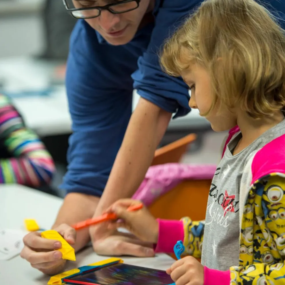 An electronic writing tablet that lets kids write, scribble, and play in vivid rainbow color!