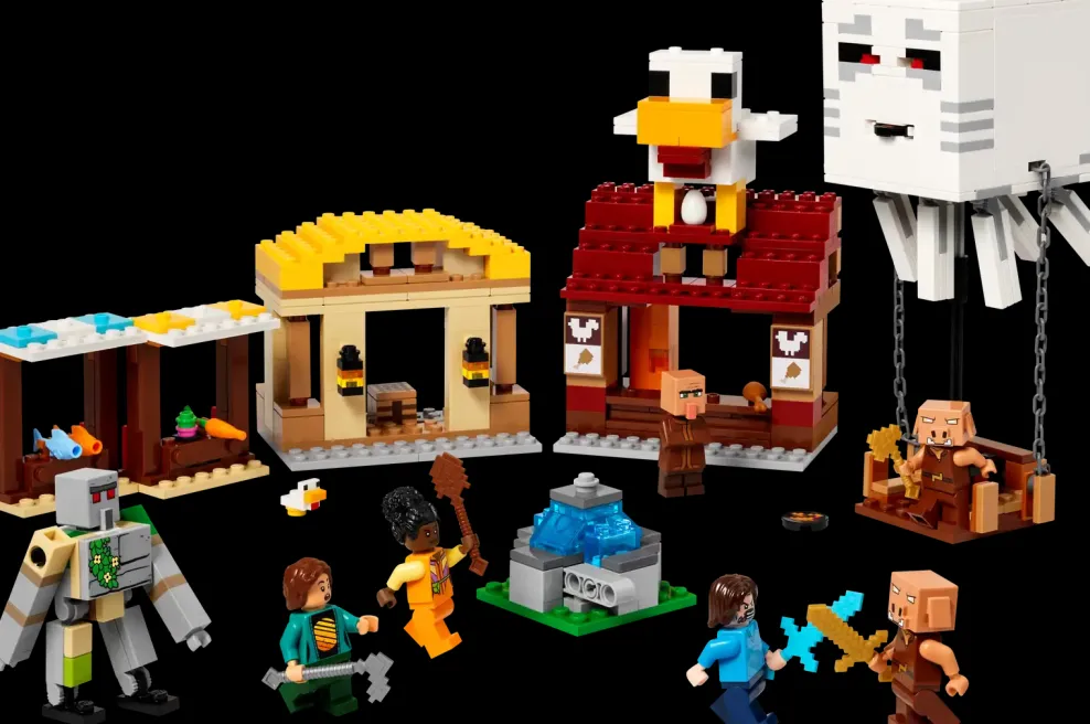 - Video game LEGO® set – When piglins launch missiles from their ghast balloon, causing the fountain to ‘explode’, kids must defend the villagers and Steve’s fried chicken restaurant and crafting shack