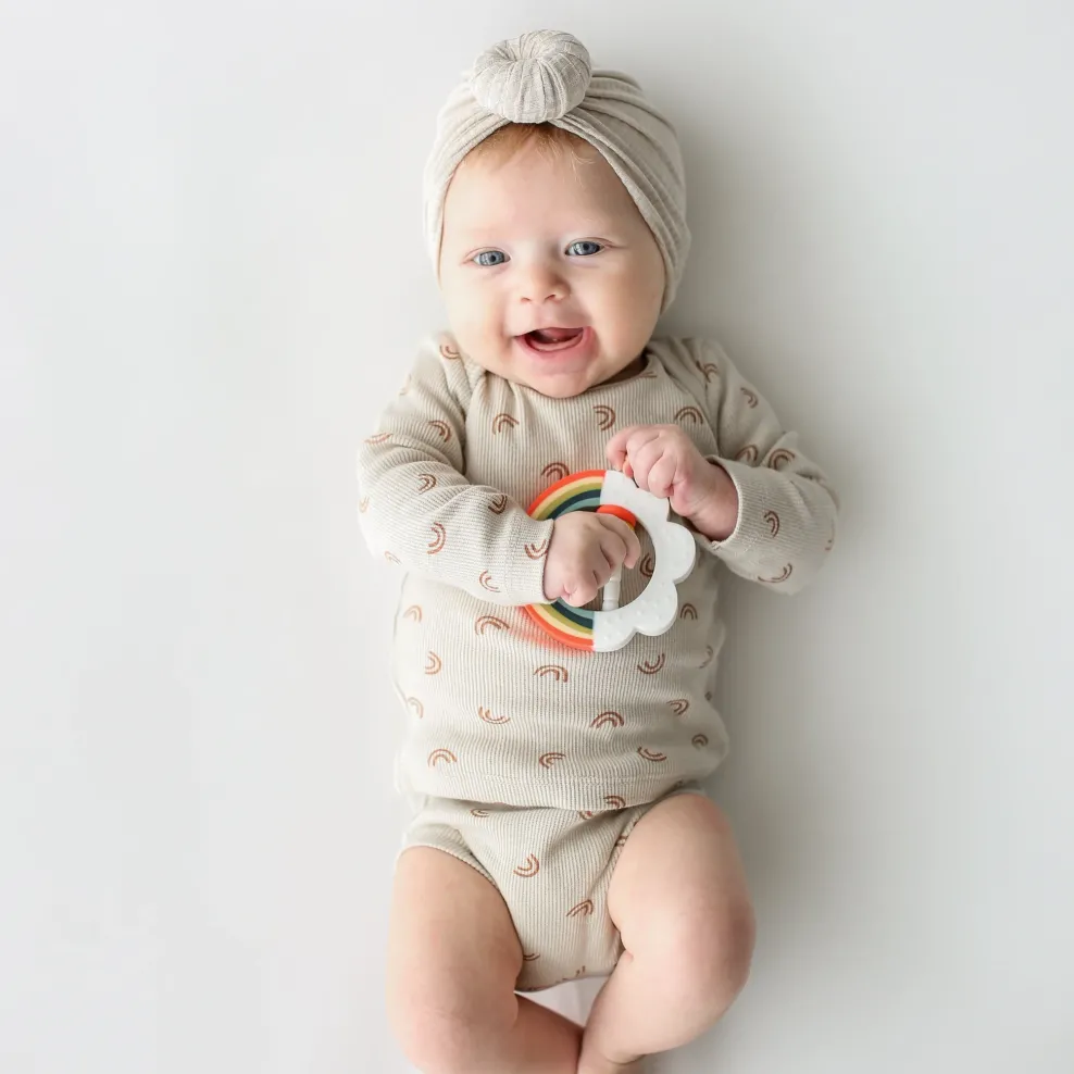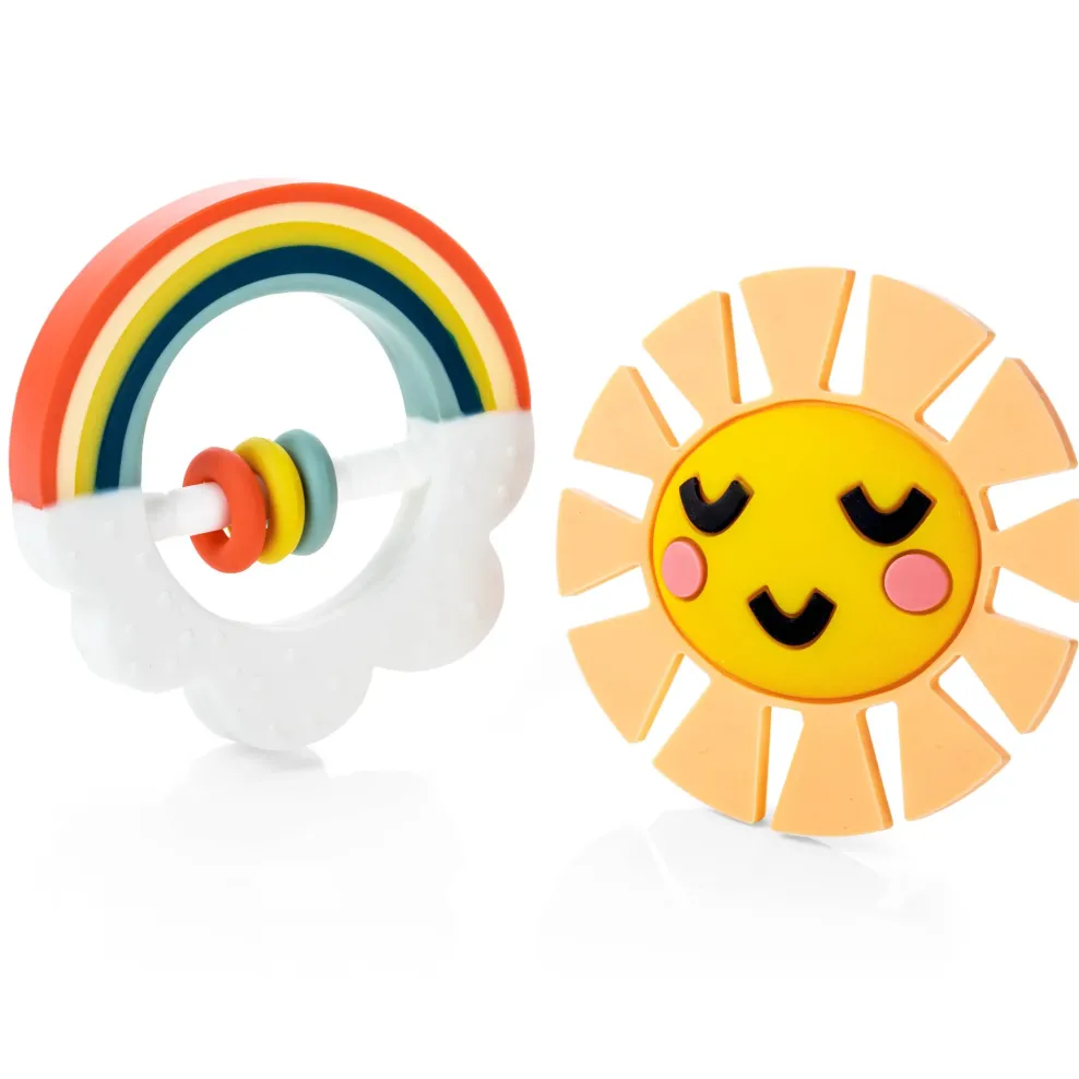 Teaching your child to be curious about the world around them starts at the very beginning! Our Little Rainbow themed chewable teethers ignite the wonder of childhood and allow your babe to explore using all their senses. The gum-soothing, soft- textured, rainbow and sun teether toy are simple fun your child won’t want to put down. Plus, it pairs perfectly with our Little Rainbow Memory Book, our Little Rainbow Lovey, and our Little Kaleidoscope Milestone Pennants!