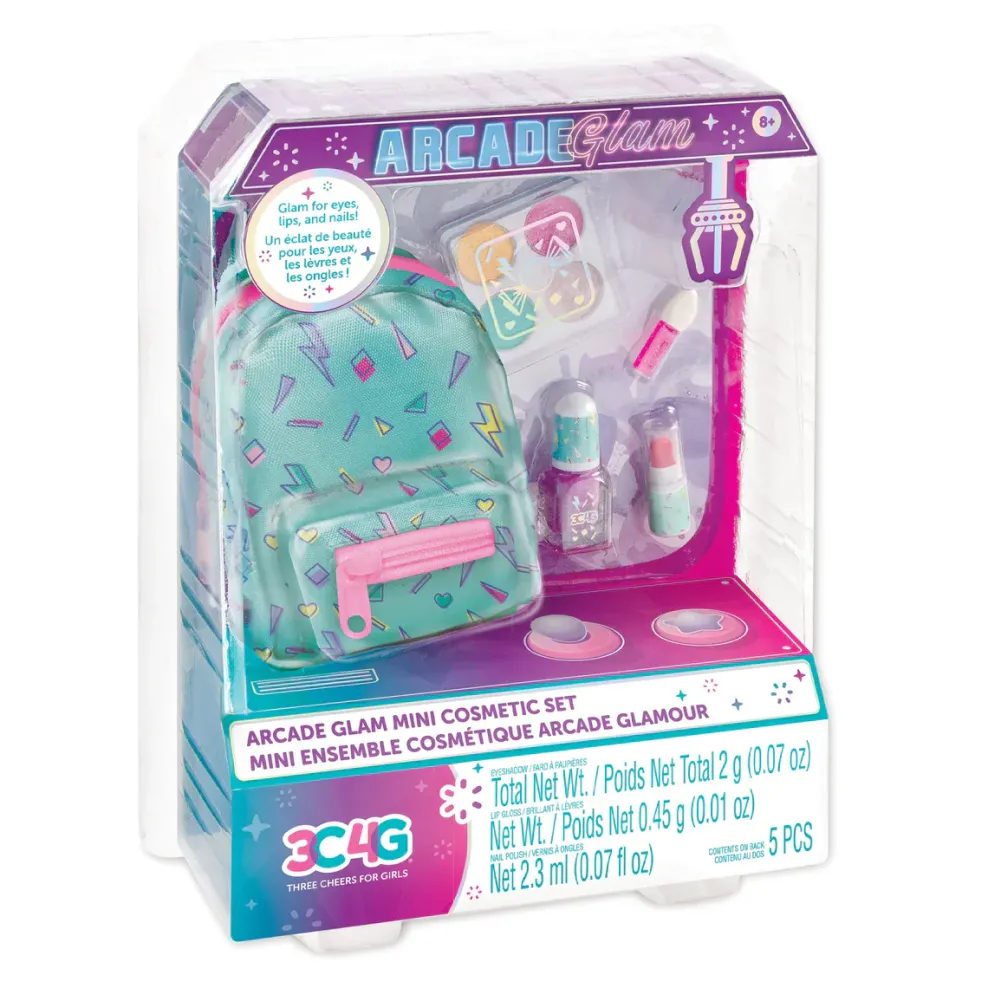 Mini cosmetics so cute you’ll want them all as a prize! Each set includes with 4 shades of eyeshadow, an applicator brush, a mini lip gloss tube, and bottle of nail polish, all storing an uber cute mini backpack. Attach to a full-sized bag with the bag clip and take this playful and uber trendy set on the go! Collect them all to sport three different mini backpack patterns and style palettes. This mini cosmetic set makes a great gift idea, whether it’s for a birthday bash, holiday, or just because